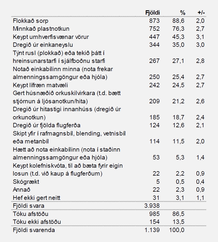 Aðeins hálft prósent aðspurðra sagðist hafa ræktað skóg, þegar spurt var hvort fólk hefði gert eitthvað síðasta árið til að draga úr þeim áhrifum sem það hefði á umhverfis og loftslagsbreytingar  Í niðurstöðunum má sjá að flestir landsmenn, tæp 63 prósent, hafa breytt hegðun sinni á ein­hvern hátt undanfarið ár til að minnka áhrif sín á umhverfi og loftslag. Um helmingur segist hafa breytt neysluvenjum af sömu ástæðu. Aukin umræða, fréttaumfjöllun og fræðsla virðist sam­kvæmt könnuninni vera það sem helst olli því að fólk vildi breyta um háttu. Greinilegur vilji er til að gera betur, til dæmis í flokkun úrgangs, og flestir Íslendingar ætla sér að ná enn betri árangri í þeim efnum. Endurvinnslumál lentu efst á listanum um æskileg verkefni sveitarfélaga.