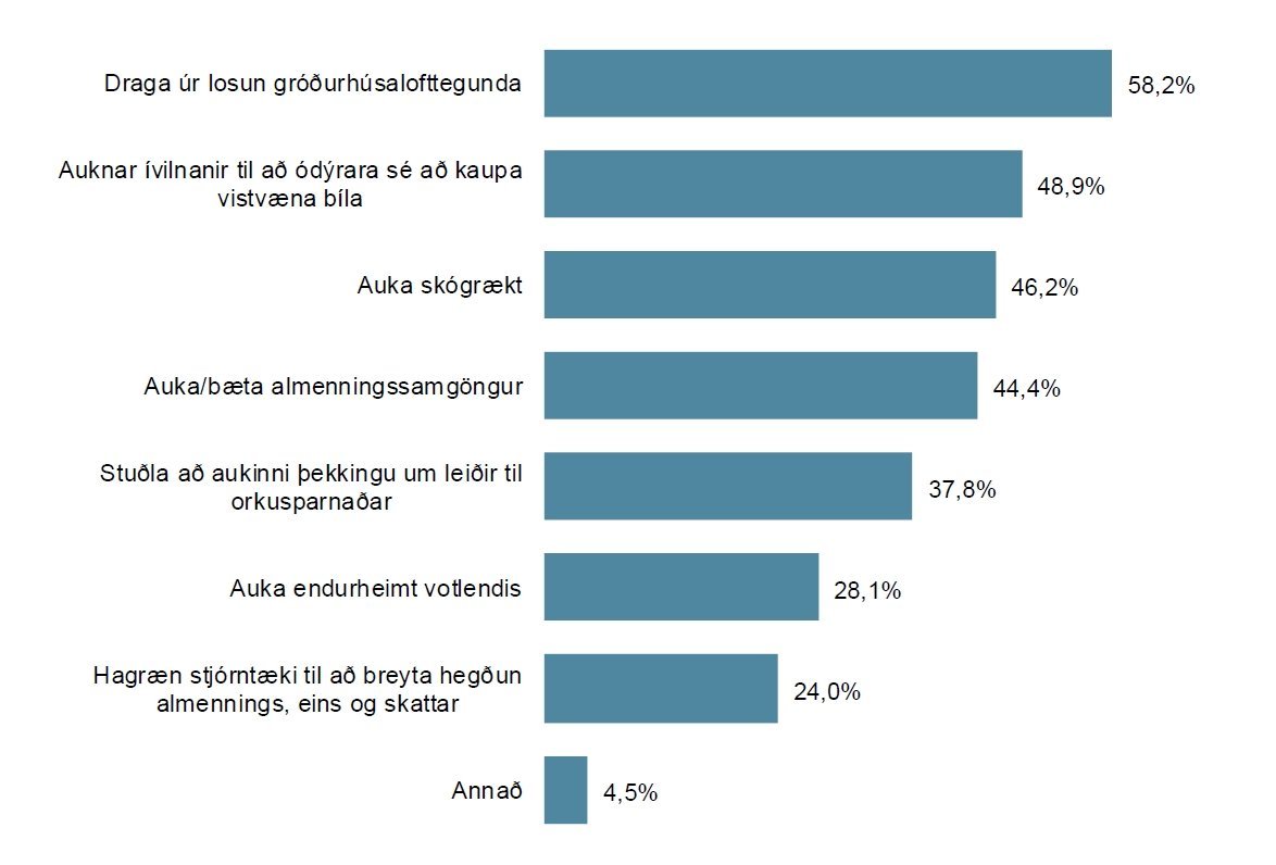 58,2 % svarenda vilja að stjórnvöld gangist fyrir því að dregið verði úr losun gróður­húsa­loft­teg­unda. 46,8% svarenda vilja að stjórnvöld hvetji til eða efli skógrækt til þess að draga úr uppsöfnun GHL í andrúmslofti. Athygli vekur aftur á móti að á síðasta ári skuli einungis 0,5% svarenda hafa lagt hönd á plóg við skógrækt í þeim tilgangi að draga úr eigin áhrifum á umhverfis- og lofts­lags­breyt­ing­ar. Af því mætti ætla að efla þyrfti tækifæri landsmanna til að vinna að skógrækt.