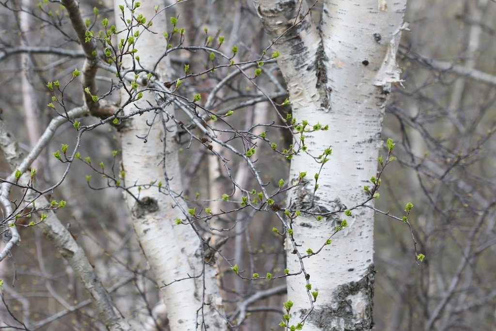 Ósvikið hvítstofna Vaglabirki að laufgast.