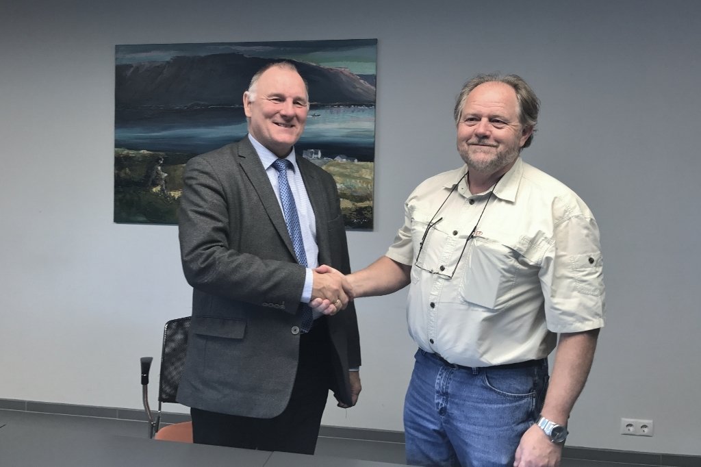 Gísli Gíslason, hafnarstjóri Faxaflóahafna, og Þröstur Eysteinsson skógræktarstjóri handsala samning um kolefnisskóga sem Skógræktin tekur að sér að rækta næstu tíu árin á þremur hekturum lands á ári.
