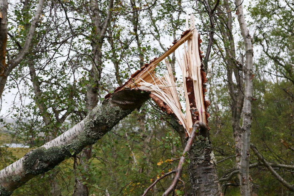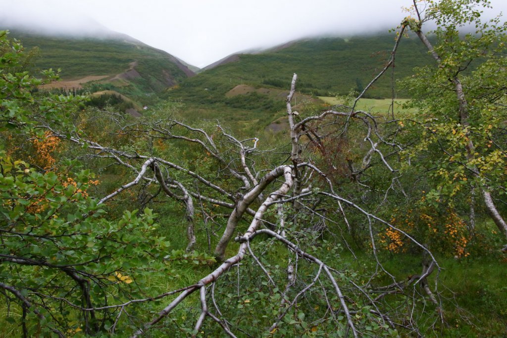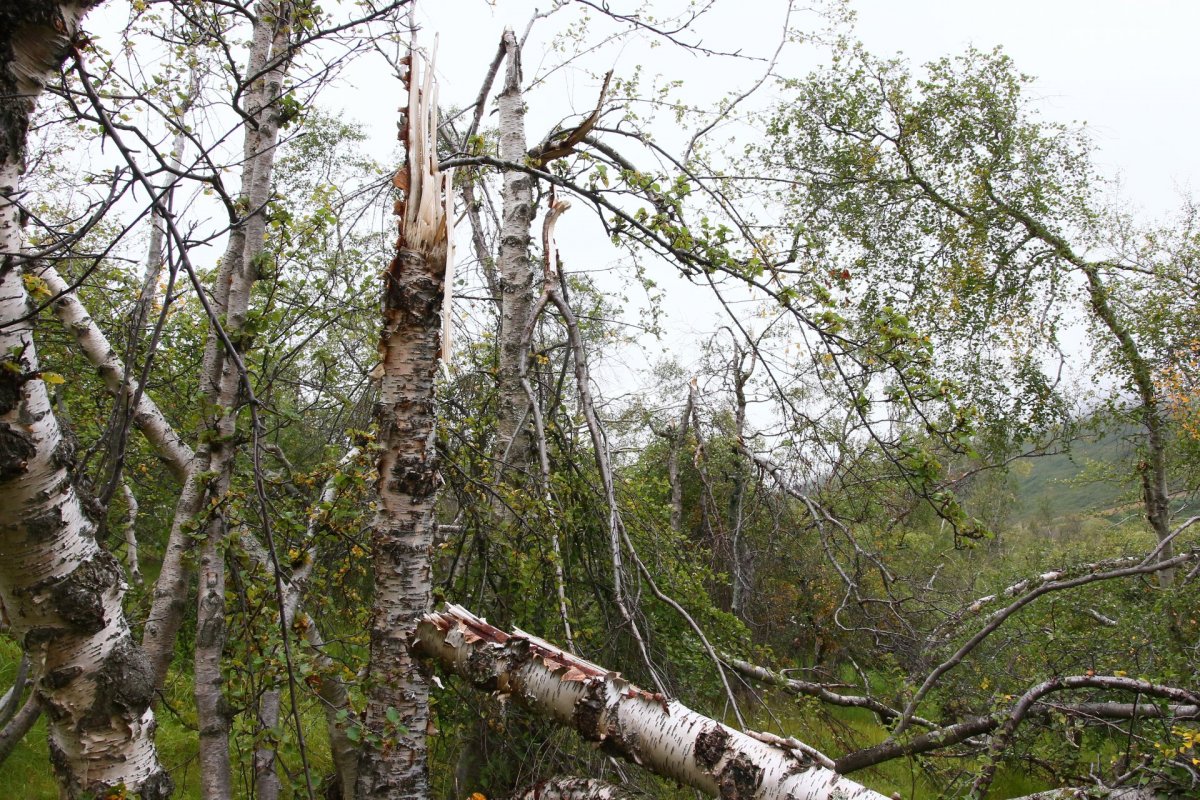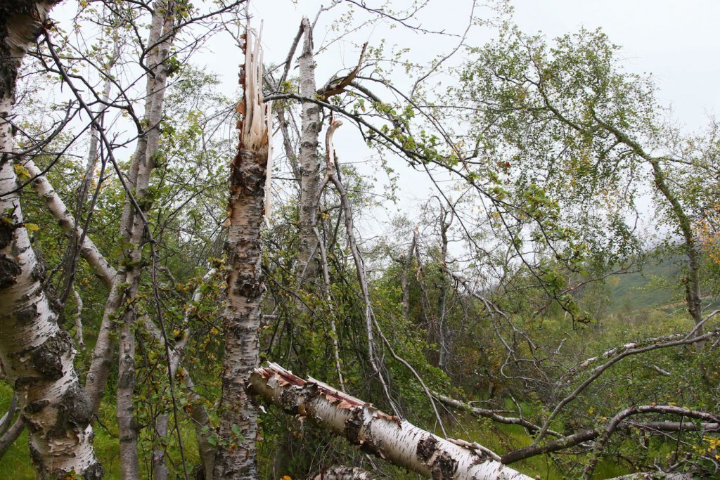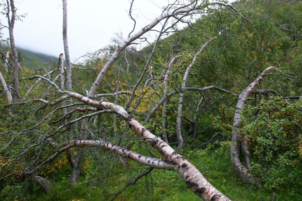 Myndarlegt birkið er víða illa brotið í Mela- og Skuggabjargaskógi. Ljósmynd: Pétur Halldórsson