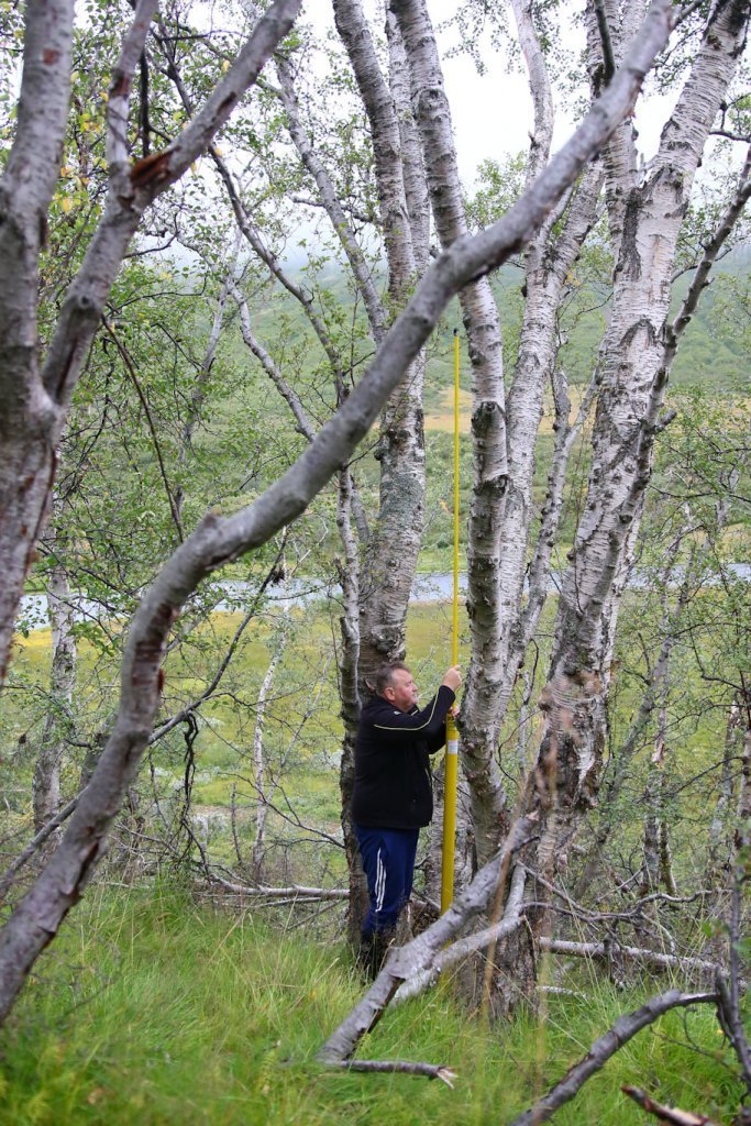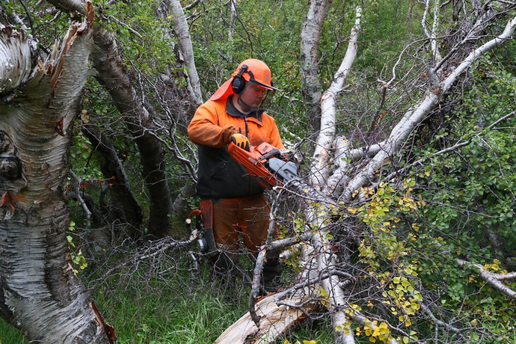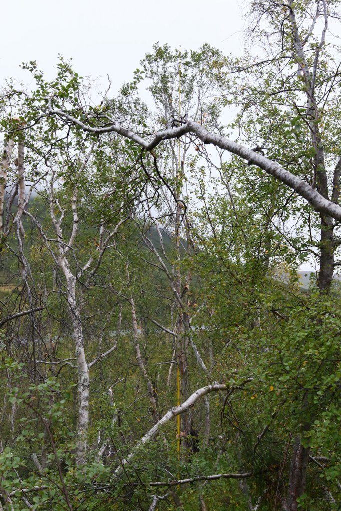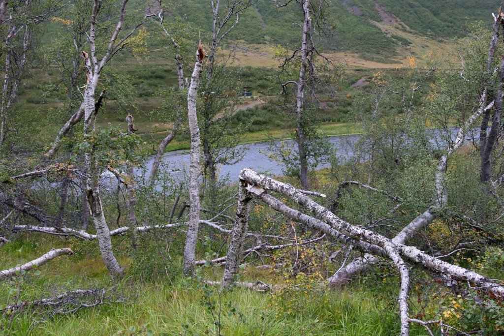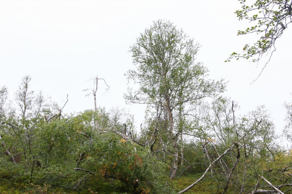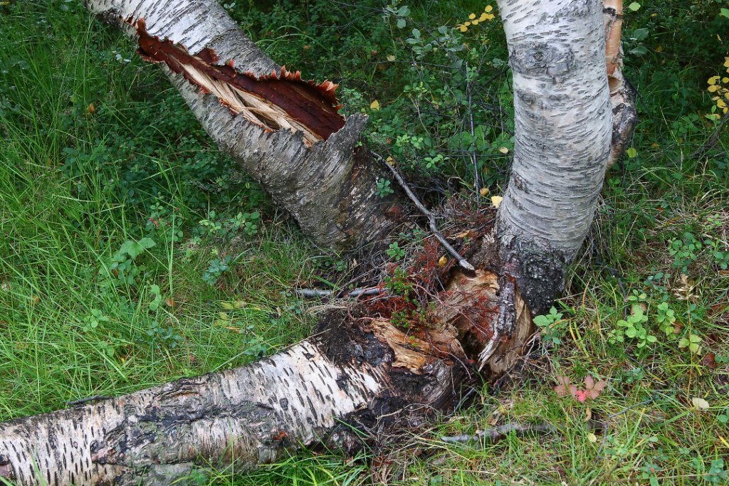 Myndarlegt birkið er víða illa brotið í Mela- og Skuggabjargaskógi. Ljósmynd: Pétur Halldórsson