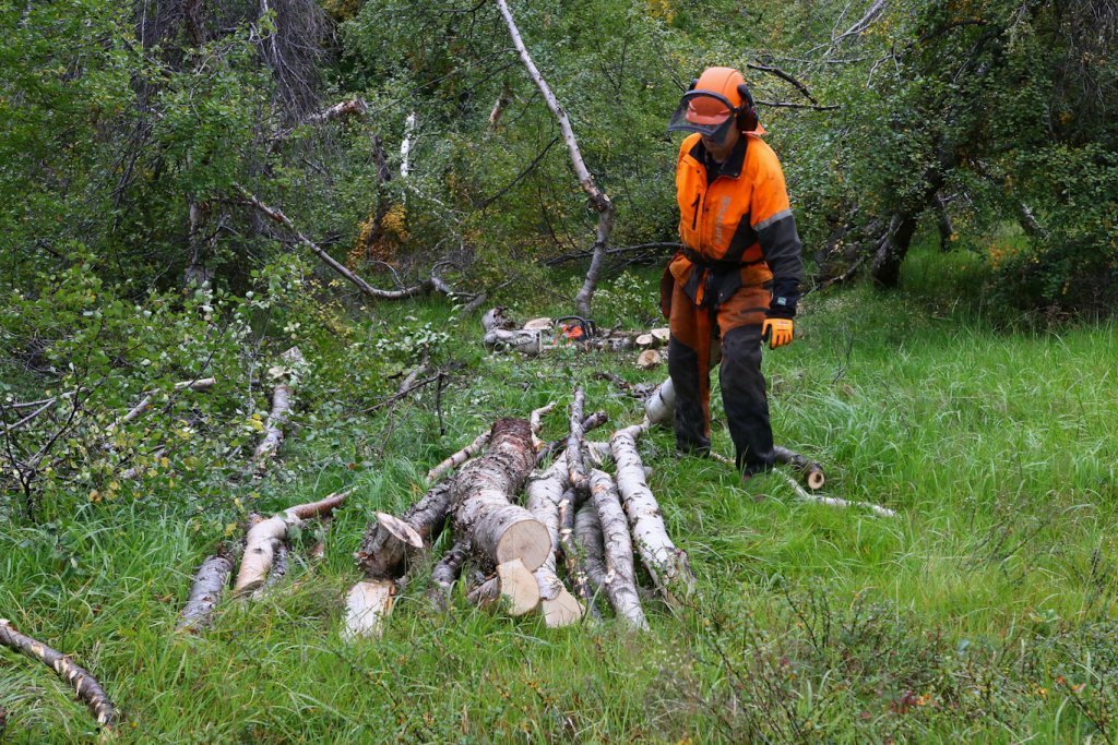 Teitur Davíðsson og Huldar Valgeirsson, starfsmenn skógarvarðarins á Norðurlandi, voru að störfum við snyrtingu á Mela- og Skuggabjargaskógi þegar skogur.is var þar á ferð í sumarlok. Aflað var hráefnis til eldiviðarvinnslu úr trjám sem féllu eða skemmdust síðasta vetur og skógurinn snyrtur með fram aðalleiðinni þar í gegn. Slík snyrting verður þó aldrei nema eins og dropi í hafið. Óvinnandi vegur er að grisja og lagfæra allan skóginn heldur verður náttúran að sjá um það með tímanum. Líklegt er að mörg ár líði þar til ummerki um snjóbrotið á liðnum vetri sjást ekki meir.