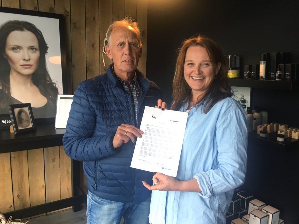 Björn Bjarndal Jónsson, verkefnastjóri afurða- og markaðsmála hjá Skógræktinni, afhendir Sóleyju Elíasdóttur, stofnanda Sóleyjar Organics, samninginn undirritaðan af Þresti Eysteinssyni skógræktarstjóra. Ljósmynd: Vala Steinsdóttir
