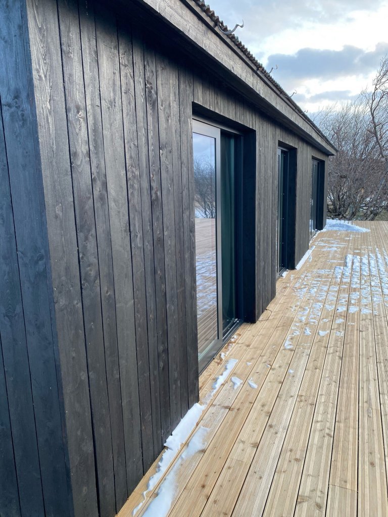 Að brenna eða sóta yfirborð timburs er ævagömul aðferð til viðarvarnar. Lerki meðhöndlað með þessum hætti kemur skemmtilega út á þessu íslenska orlofshúsi. Ljósmynd: Aðsend