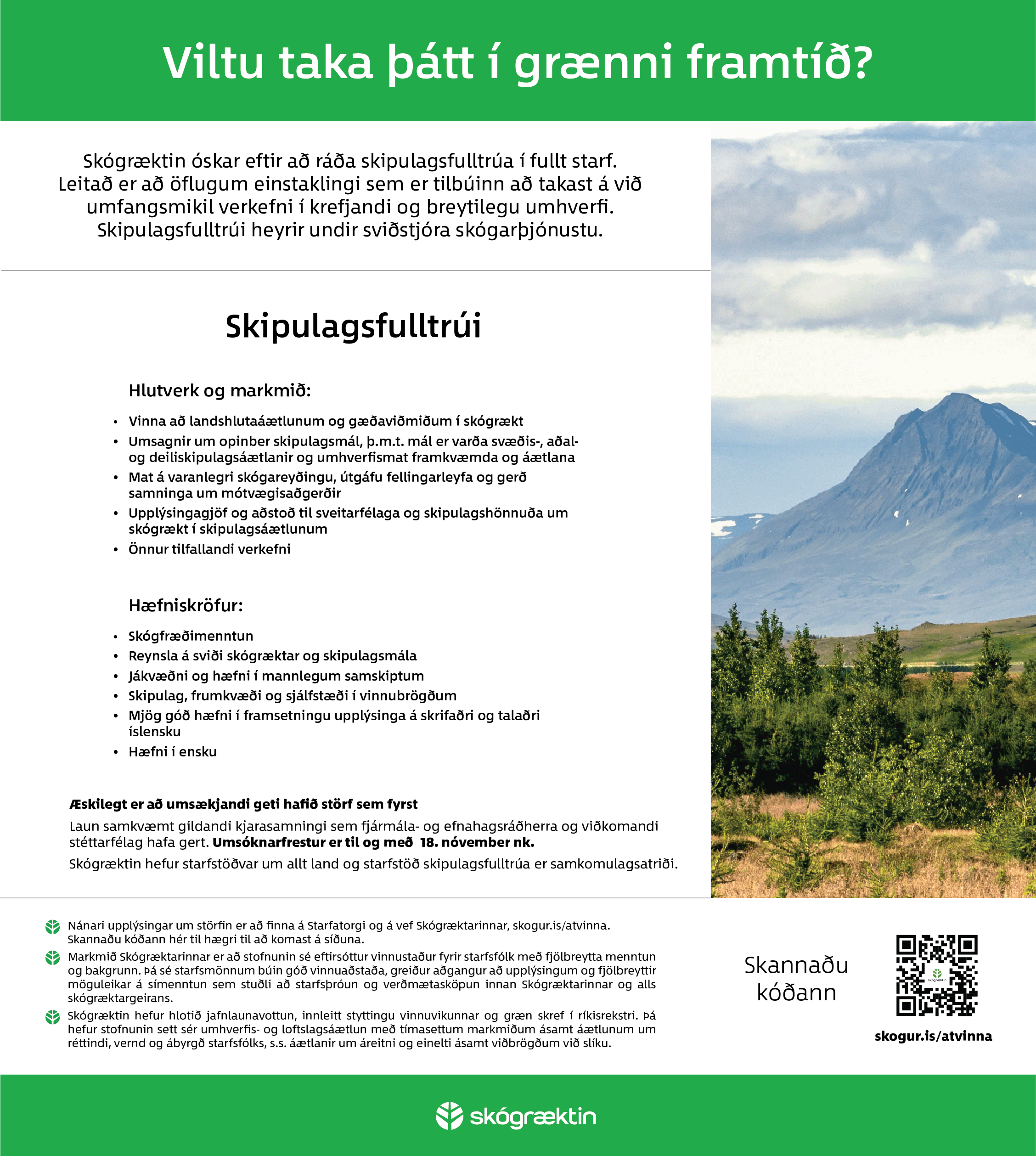 Skógræktin óskar eftir að ráða skipulagsfulltrúa í fullt starf. Leitað er að öflugum einstaklingi sem er tilbúinn að takast á við umfangsmikil verkefni í krefjandi og breytilegu umhverfi. Skipulagsfulltrúi heyrir undir sviðstjóra skógarþjónustu.