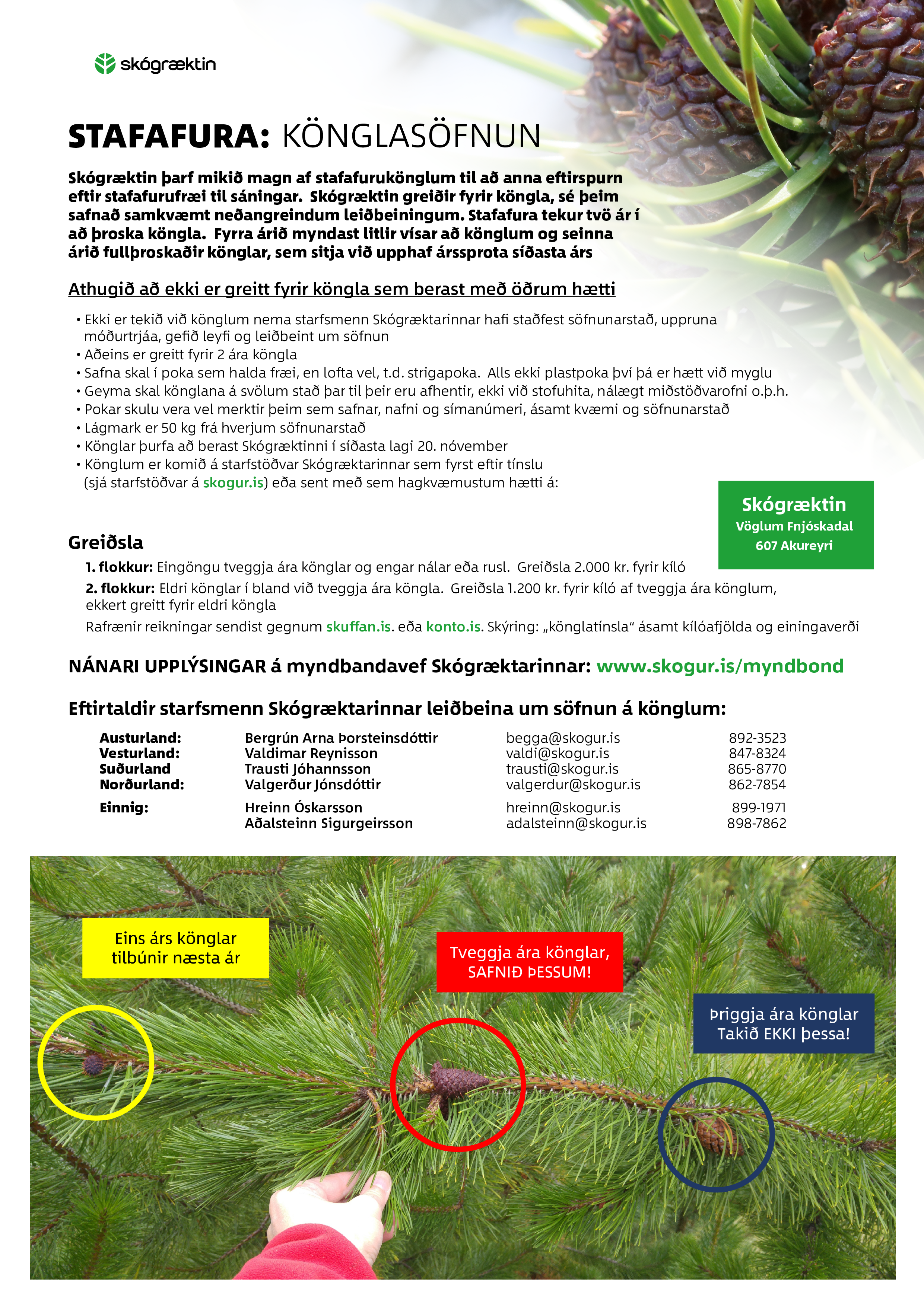Skógræktin þarf mikið magn af stafafurukönglum til að anna eftirspurn eftir stafafurufræi til sáningar. Greitt er fyrir köngla, sé þeim safnað samkvæmt leiðbeiningum. Óskað er eftir könglum til sáningar á komandi vetri.