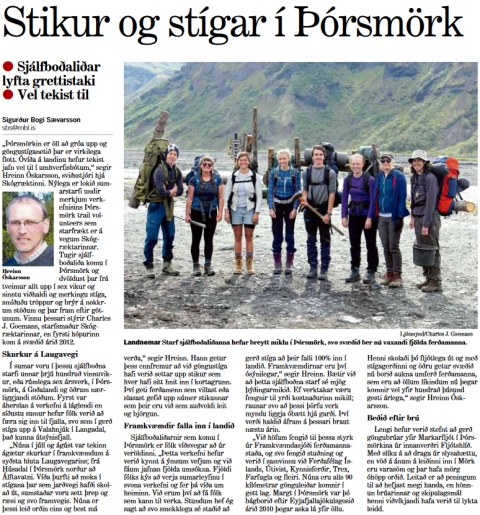 Óvíða hefur tekist jafnvel til við umhverfisbætur en í Þórsmörk segir Hreinn Óskarsson, sviðstjóri hjá Skógræktinni, í frétt sem birtist á baksíðu Morgunblaðsins í dag. Þar er fjallað um sjálfboðastarf við stígagerð og landbætur sem unnið er árlega í Þórsmörk og á nágrannasvæðum. Komið hefur verið upp merkjakerfi sem eykur öryggi ferðafólks ef óhöpp verða og flýtir fyrir björgun.