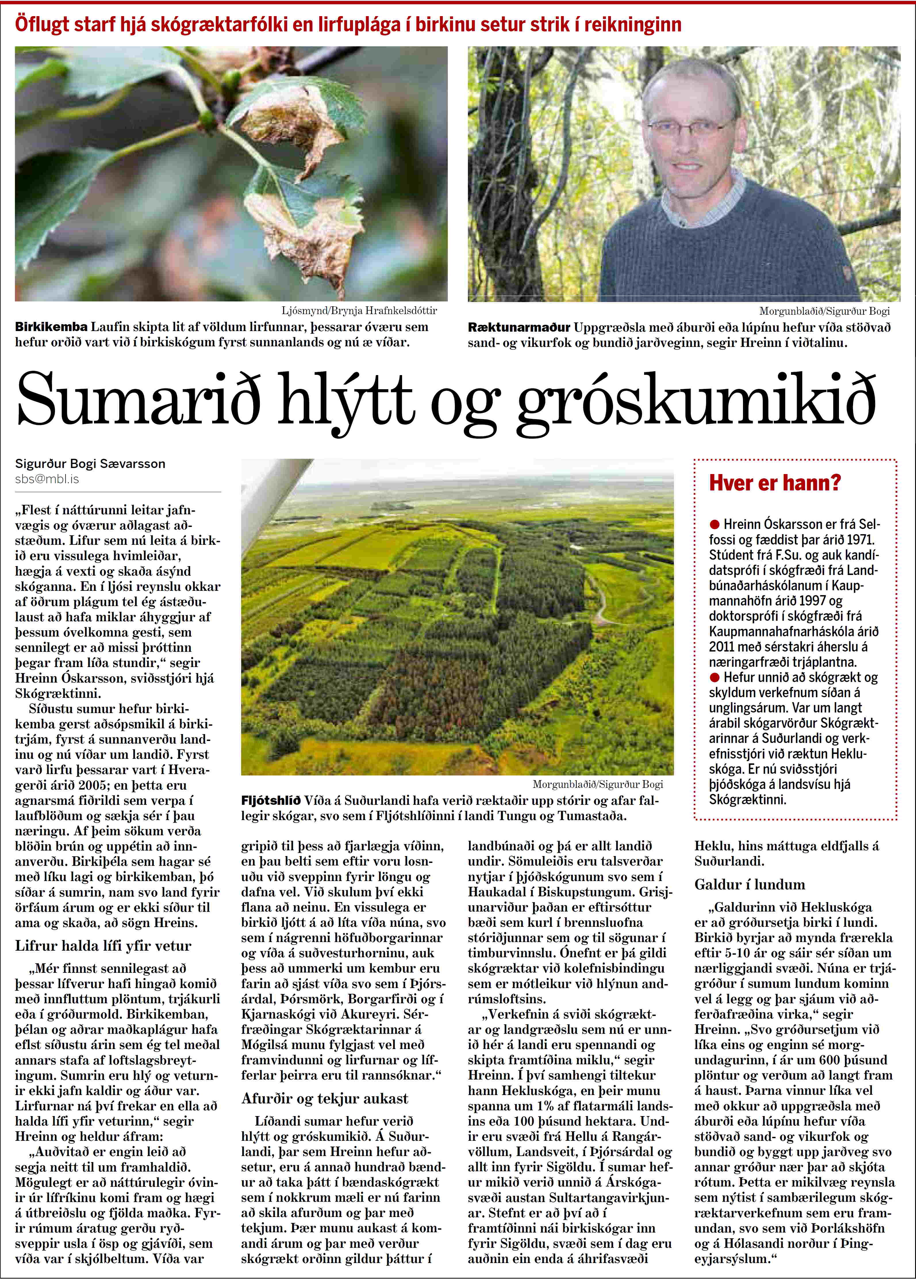 Rætt var við Hrein um vöxt og viðgang í skógum landsins í Morgunblaðinu 20. júlí. Sigurður Bogi Sævarsson ræðir þar við Hrein og viðtalið er á þessa leið: