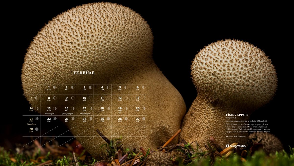 Notendur rafræns dagatals Skógræktarinnar geta í dag skipt um skjámynd á tölvum sínum og sett inn dagatal febrúarmánaðar. Á því er ljósmynd Atla Arnarsonar ljósmyndara af físisvepp.
