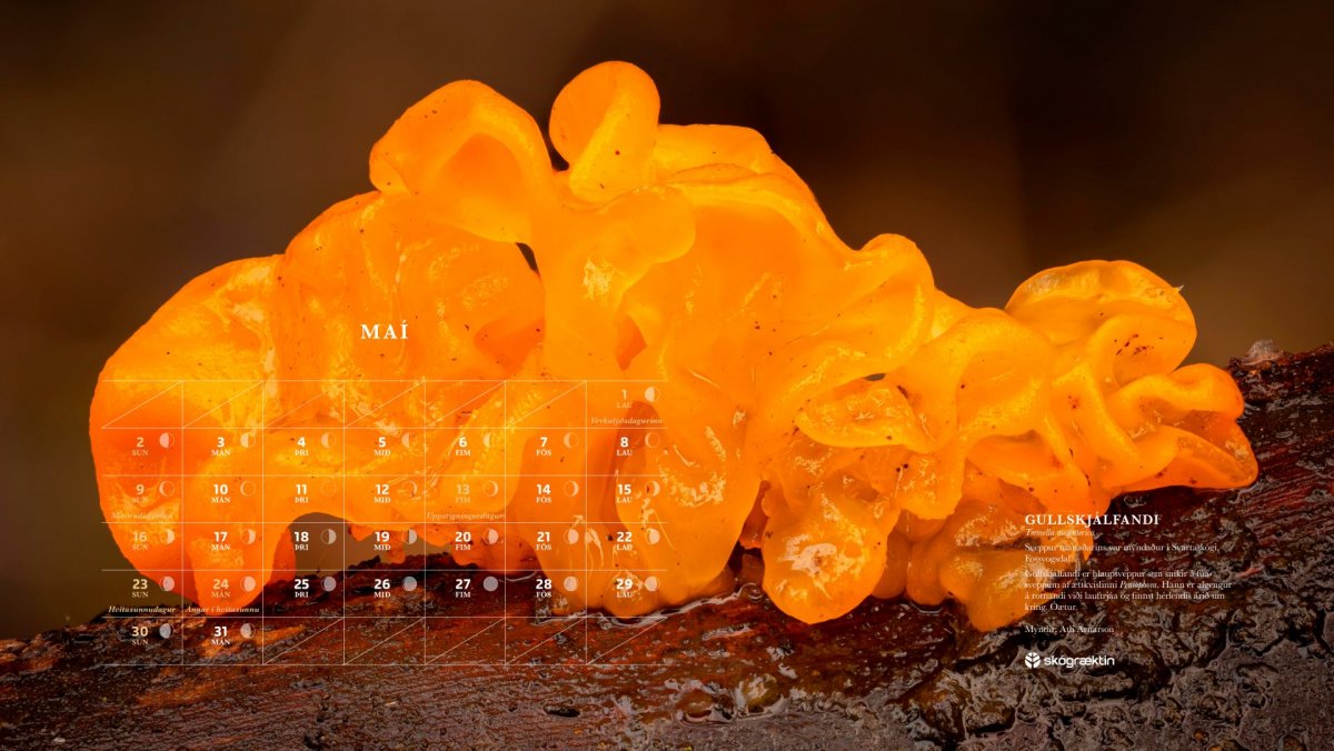 Notendur rafræns dagatals Skógræktarinnar geta nú skipt um skjámynd á tölvum sínum og sett inn dagatal maímánaðar. Á því er ljósmynd Atla Arnarsonar ljósmyndara af sveppnum gullskjálfanda.