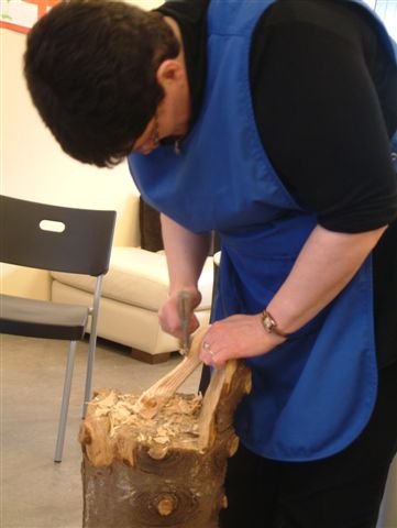 Einu sinni í viku hittist hópur á vegum Rauða krossins í Borgarnesi og lærir að tálga og vinna með ferskan við. Eins og á hefðbundnum námskeiðum á vegum Lesið í skóginn læra þátttakendur fyrst af öllu tálgutæknina, þ.e.a.s. tálga bæði að sér og frá og læra að brýna og halda góðu biti í áhöldunum. Þeir skefta einfaldan nytjahlut, s.s. ostahníf, læra að kljúfa efni í smjörhníf og síðan taka við flóknari verkefni, t.d. ausu- og bollagerð. Leiðbeinandi á námskeiðunum er fræðslustjóri Skógræktar ríkisins, Ólafur Oddsson.