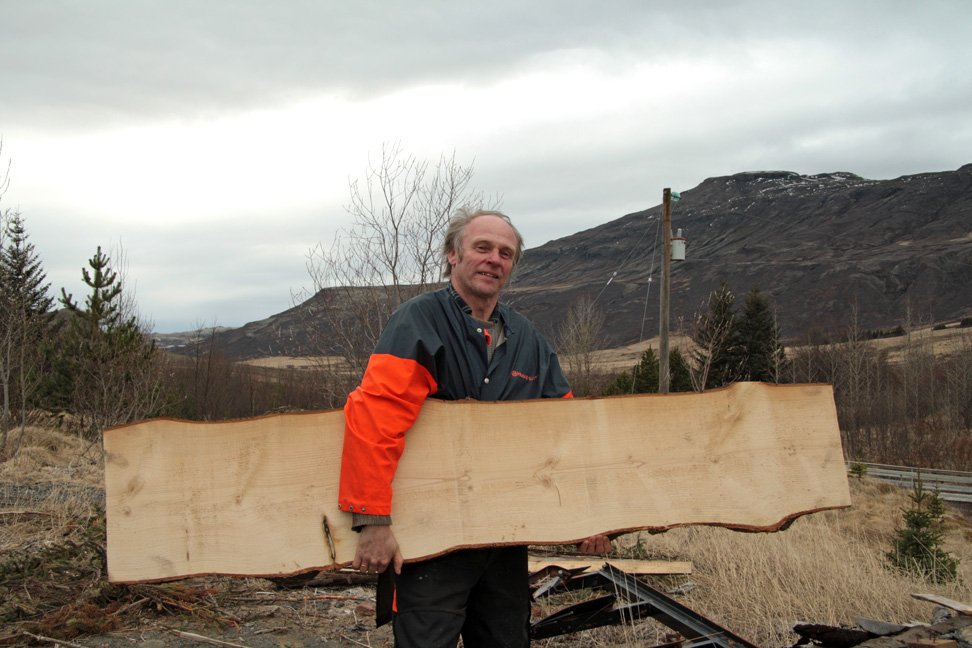 Eins og meðfylgjandi myndir sýna eru trén sem flett eru engin smá smíði og þau sverustu yfir 40 cm í þvermál. Írskir skógfræðinemar frá Háskólanum í Dublin sem eru í starfsnámi þessar vikurnar hjá Skógrækt ríkisins, kynntust timburflettningu undir leiðsögn Einars Óskarssonar, verkstjóra í Haukadal.