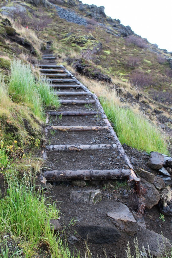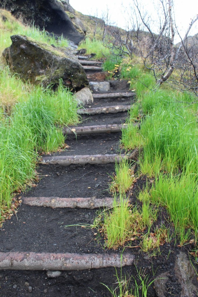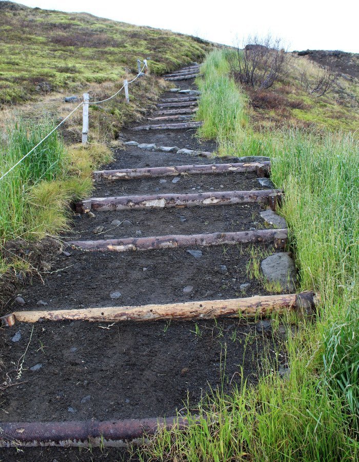 Oft er líka gott að nota timbur til að styrkja hliðar á tröppum, sérstaklega þar sem tröppur eru lagðar yfir grjót og klappir. Þetta tryggir betur að malarefni í tröppum haldist á sínum stað, sjá þriðju myndina hér að neðan. Við nýlegar lagfæringar má gjarnan sjá gróskumikið rýgresi vaxa með fram stígum og tröppum. Þetta er einær eða í mesta lagi tvíær grastegund sem notuð er til að binda saman jarðveginn og mynda set fyrir gróðurinn sem fyrir er á svæðinu. Sáning rýgresis flýtir fyrir því að ummerki um rask vegna framkvæmdanna hverfi og mannvirkin falli sem best inn í landslagið. Ella væri hætt við að laus jarðefni myndu skolast burt á fyrsta vetri eftir framkvæmdirnar.