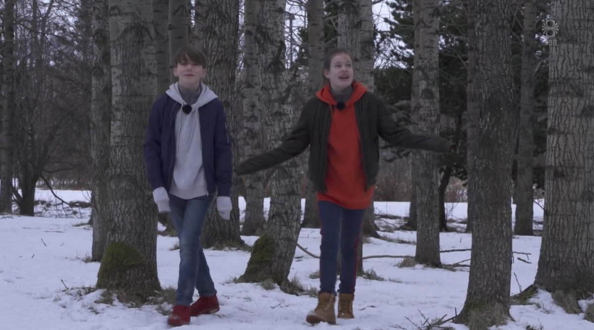 Baldur Björn Arnarsson og Linda Ýr Guðrúnardóttir dagskrárgerðarmenn í skóginum á Mógilsá. Skjámynd úr Stundinni okkar