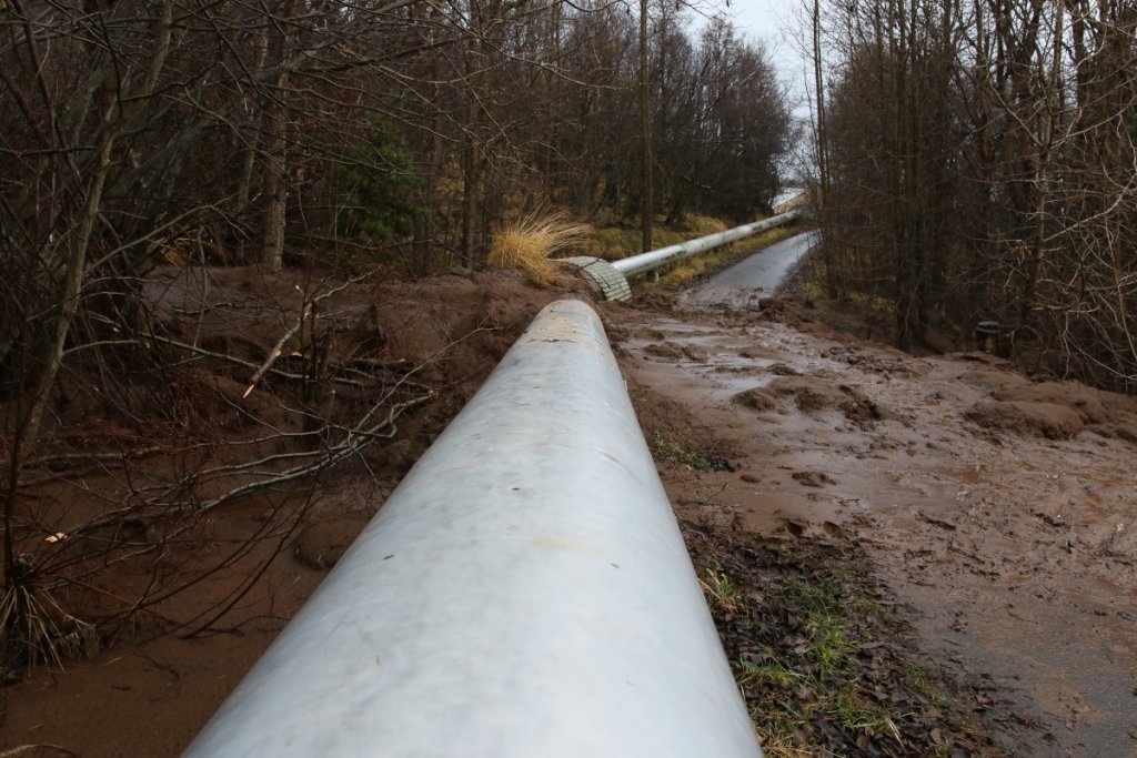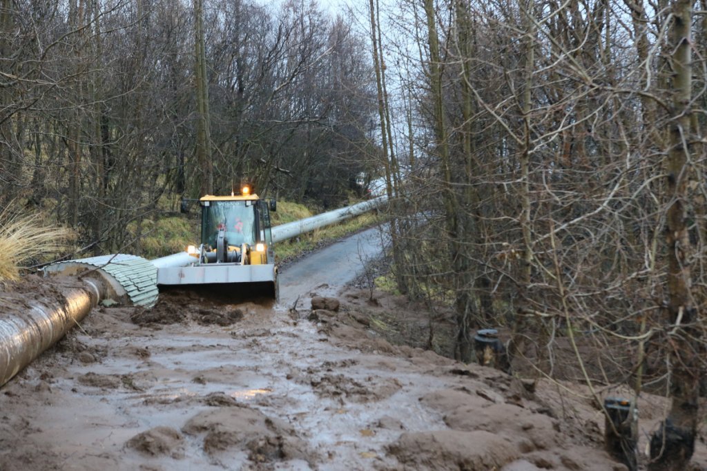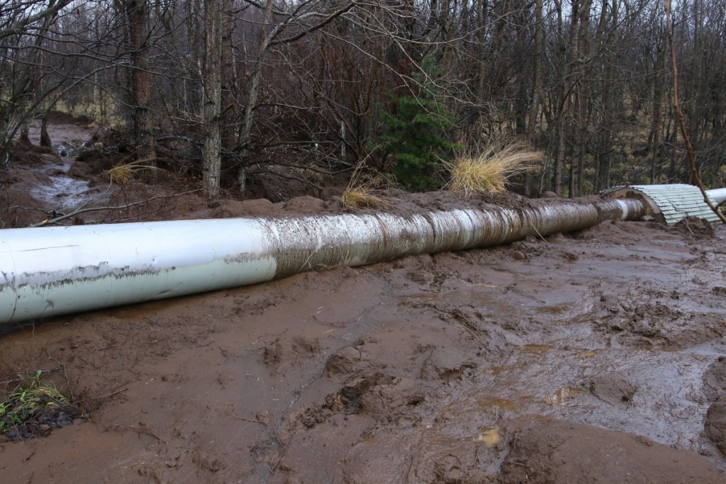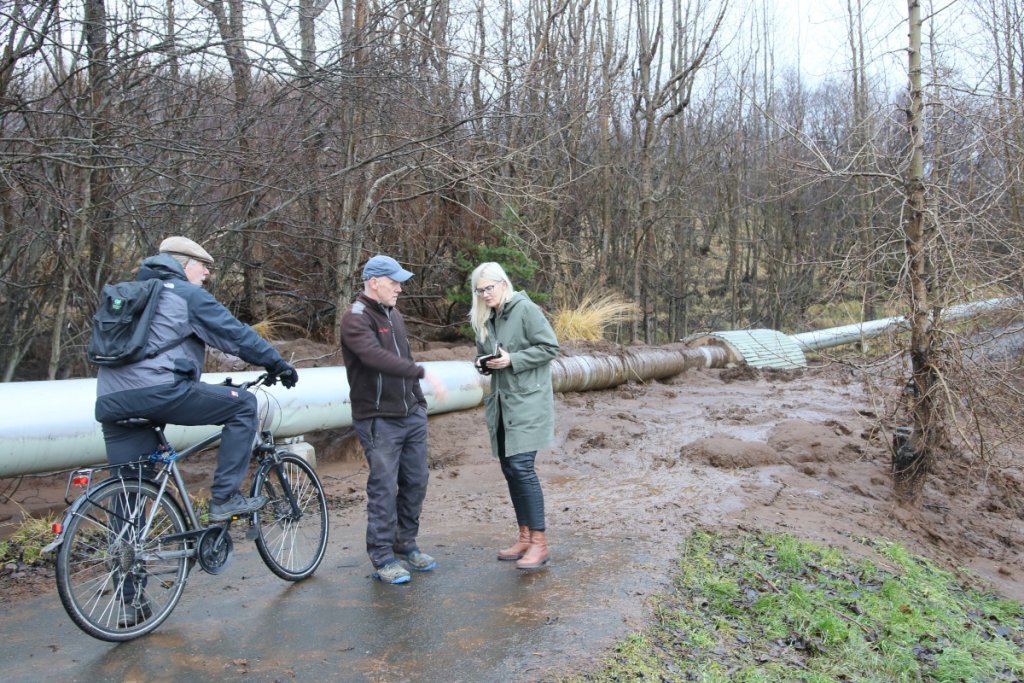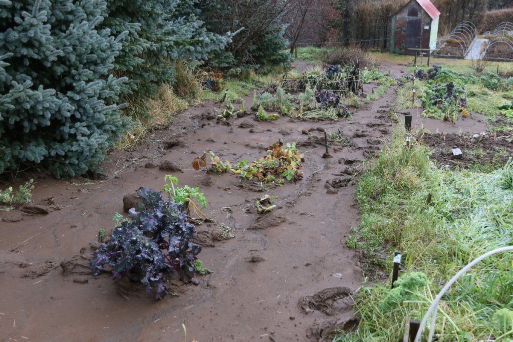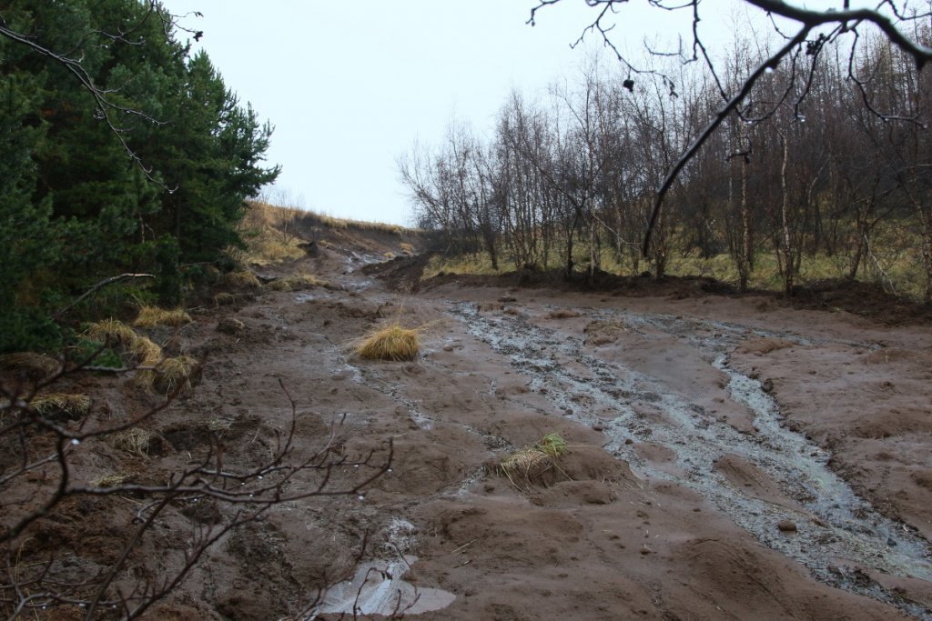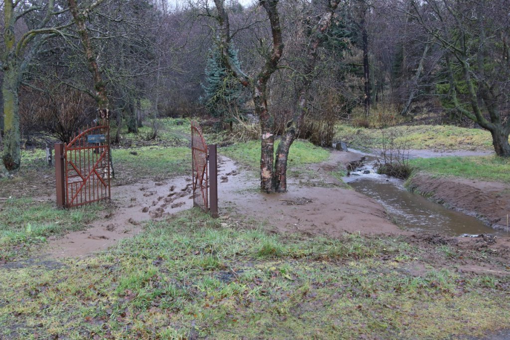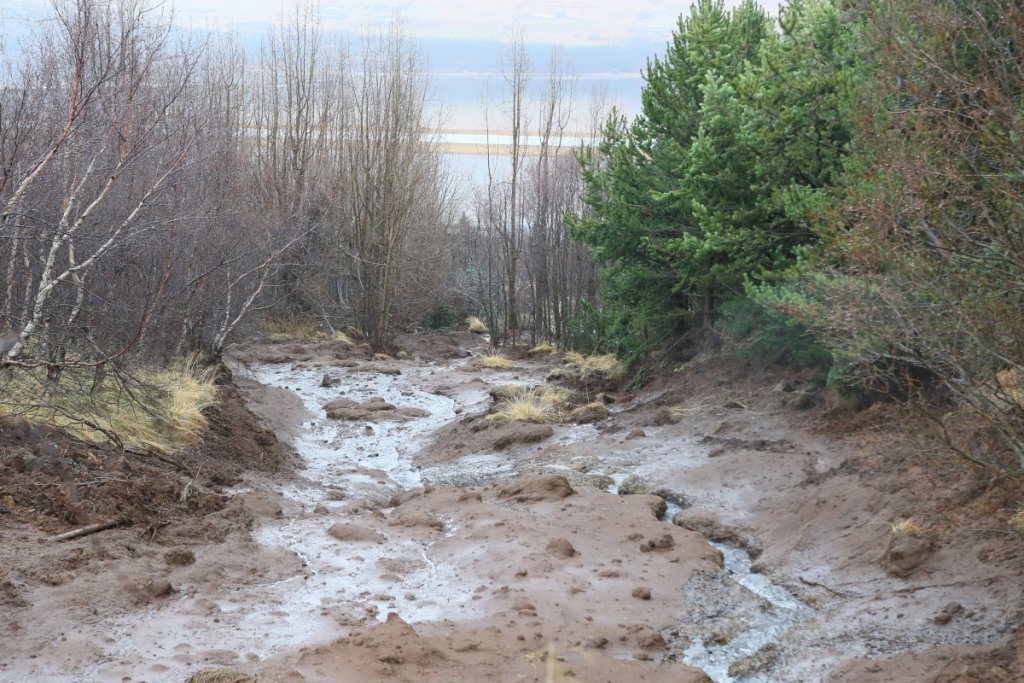 Mikið hefur rignt á Akureyri undanfarna daga og mældist sólarhringsúrkoman frá kl. 9 í gærmorgun fram til níu í morgun 27,5 millímetrar. Byggingaframkvæmdir standa nú yfir í Hagahverfi sem er uppi á brekkunni ofan við Gömlu-Gróðrarstöðina og frárennslislagnir ekki fullfrágengnar. Neðan hverfisins er gamalt tún og norðan við það rennur lækur í litlu gili.