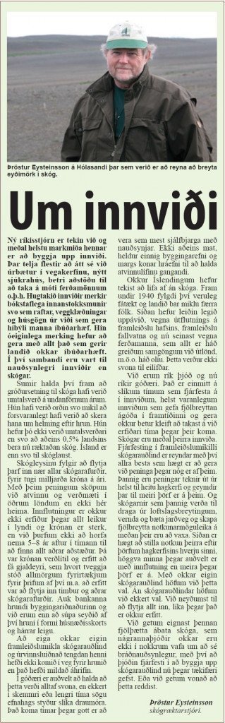 Ný ríkisstjórn er tekin við og meðal helstu markmiða hennar er að byggja upp innviði. Þar telja flestir að átt sé við úrbætur í vegakerfinu, nýtt sjúkrahús, betri aðstöðu til að taka á móti ferðamönnum o.þ.h. Hugtakið innviðir merkir bókstaflega innanstokksmunir svo sem raftar, veggklæðningar og húsgögn úr viði sem gera híbýli manna íbúðarhæf. Hin óeiginlega merking hefur að gera með allt það sem gerir landið okkar íbúðarhæft. Í því sambandi eru vart til nauðsynlegri innviðir en skógar.