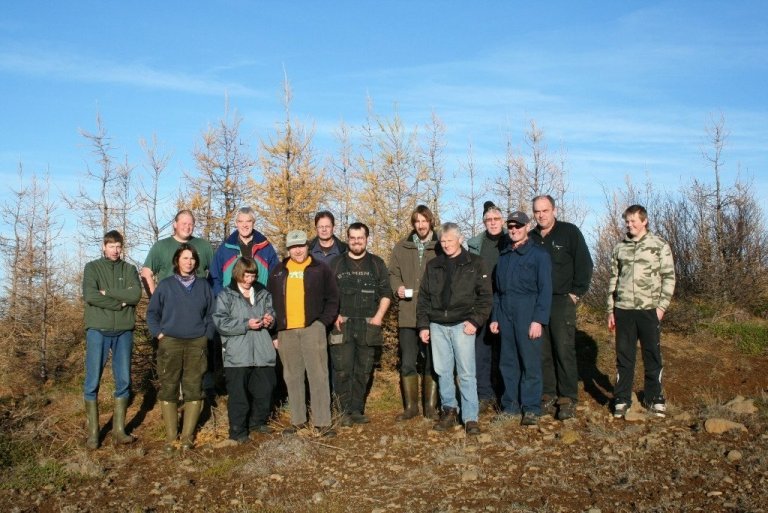 Til gamans má geta að á fyrsta námskeiðinu 2010 var tekin hópmynd með nýsnyrtan skóg í bakrunni. Þá var skógurinn einstaklega illa á sig komin og trén meira og minna fjölstofna, fjöltoppa, grófgreinótt og bogin. Hópmyndin sem tekin var núna er frá svipuðu sjónarhorni og þar má sjá feikilegan vöxt beinvaxinna lerkitrjáa 7 árum síðar og því um ólíkt betri skóg að ræða en hér áður var lýst. Umhirða ungskóga borgar sig margfalt.