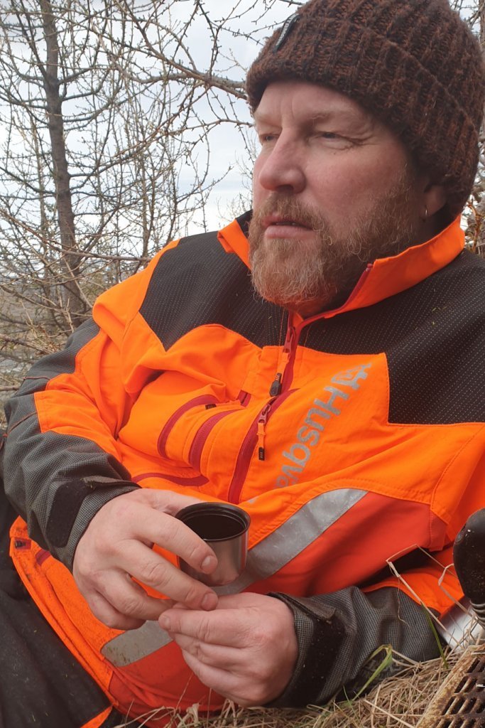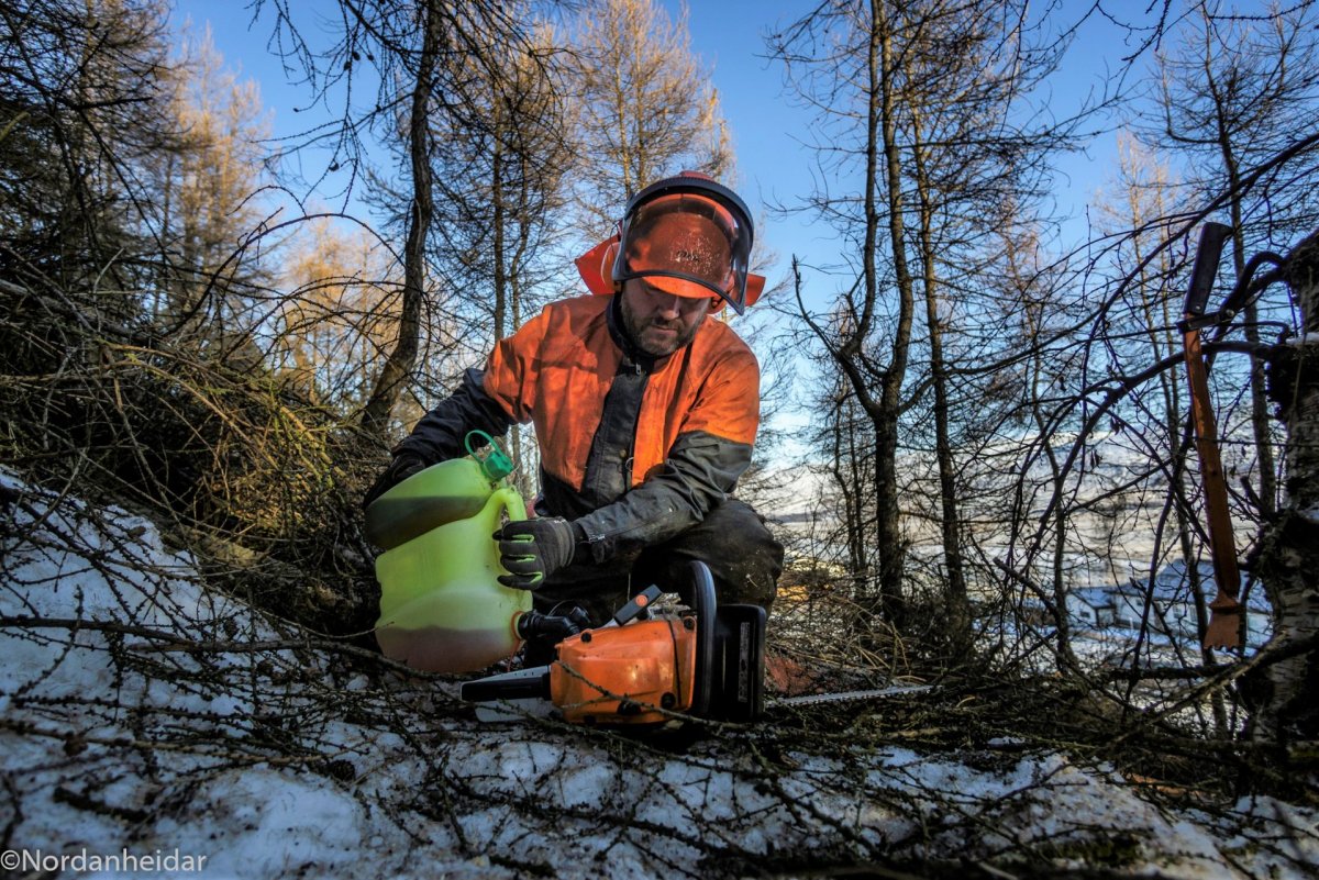 Jón Heiðar Rúnarsson skógverktaki setur eldsneyti á sögina. Verkefnin eru næg við grisjun í skógunum og tryggja þarf fjármagn áfram, segir hann. Einnig þarf að huga að lengri námskeiðum fyrir skógarhöggsfólk með meiri þjálfun svo fólk sé fljótara að ná upp afköstum. Ljósmynd: Norðanheiðar/Johan Holst