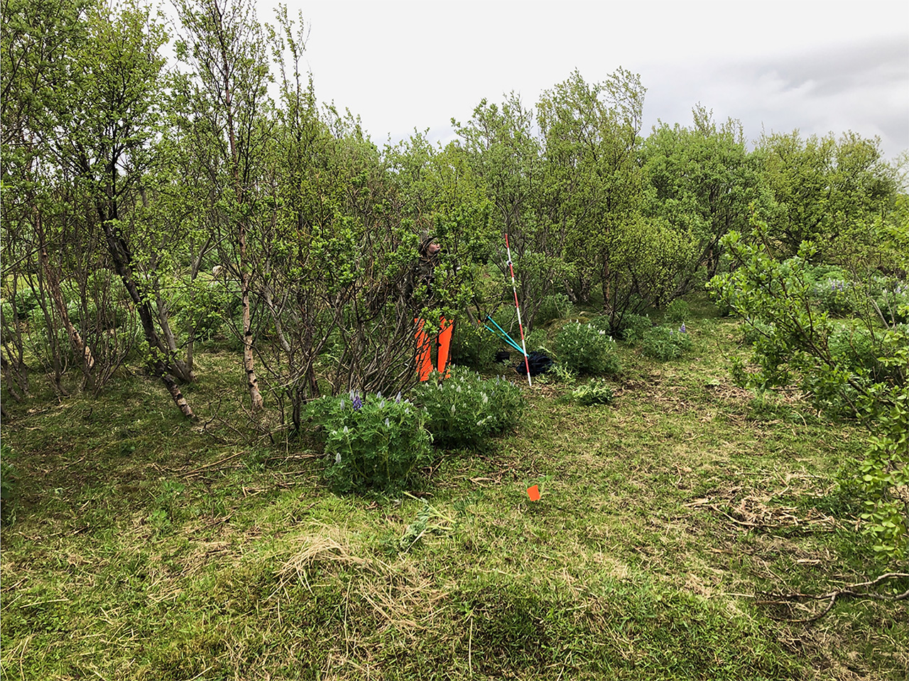 Mynd 1. Mælistaður (Eyjafjörður) í jaðarbelti með 14 fræplöntum af birki á 100 fermetrum. Ljósmynd: ÍSÚ