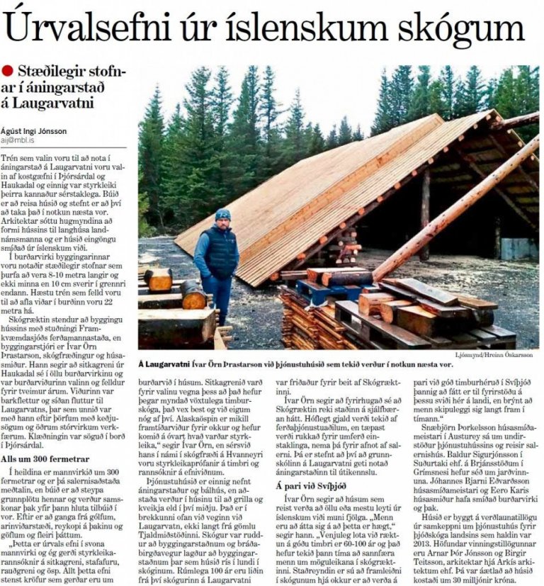 Morgunblaðið fjallar um þjónustuhúsið í Laugarvatnsskógi á baksíðu sinni í dag og þar er rætt við Ívar Örn sem segir meðal annars að húsum sem reist séu úr íslensku timbri að öllu eða mestu leyti muni fjölga á komandi árum enda sé framleiðni í íslenskum skógum sambærileg við það sem gerist í Skandinavíu og menn séu að átta sig á því að þetta sé hægt.