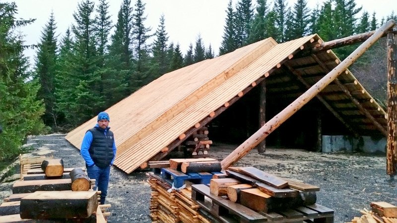 Byggingameistari hússins, Ívar Örn Þrastarson, stendur við bálskýlið sem nú er komið undir þak.