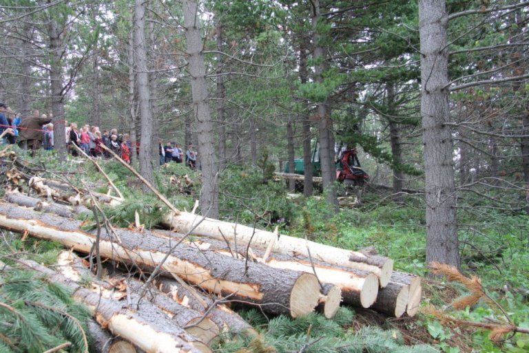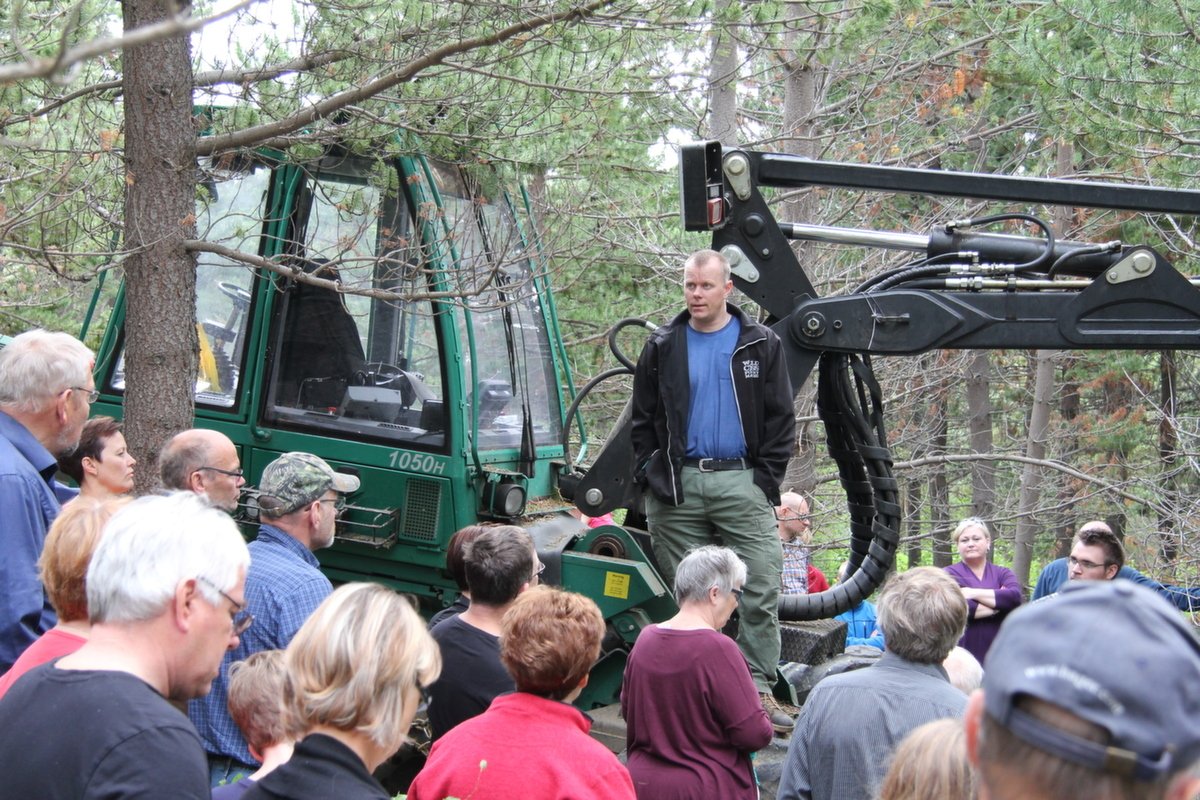 Gestir á skógardeginum á Vöglum fylgdust af miklum áhuga með þegar Kristján Már Magnússon skógverktaki kynnti grisjunarvél sína. Hann fór yfir möguleika og kosti vélarinnar og sagði til dæmis frá þeim miklu kröftum sem þarna eru að verki.