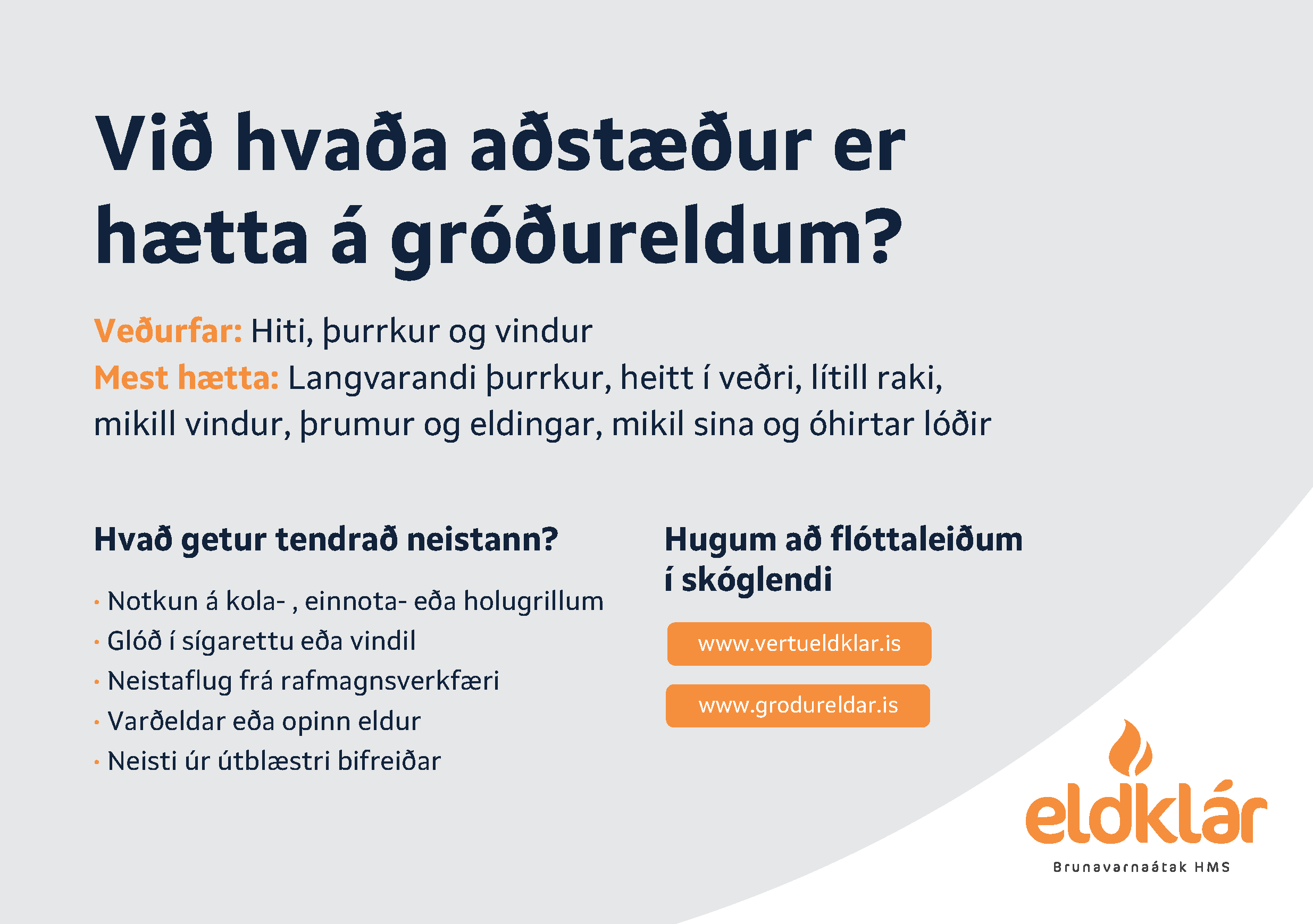 Þess vegna er allramikilvægast að koma í veg fyrir að eldur kvikni í gróðurlendi og í öðru lagi að fólk sé viðbúið strax og slíkur eldur kviknar. Þá þarf að eiga búnað til að slökkva eld í fæðingu en líka hafa í huga flóttaleiðir, eiga símanúmer hjá nágrönnum í sumarbústaðabyggðum og þess háttar. Á þessa hluti er bent í nýju myndbandi sem komið er út á vef Húsnæðis- og mannvirkjastofnunar (HMS). Myndbandið er hluti af átakinu Eldklár sem stofnunin hefur forystu um. Fyrstu viðbrögð við gróðureldi ef ekki tekst að kæfa hann í fæðingu eru alltaf að hringja í neyðarnúmerið 112 og láta fólk í nágrenninu vita.