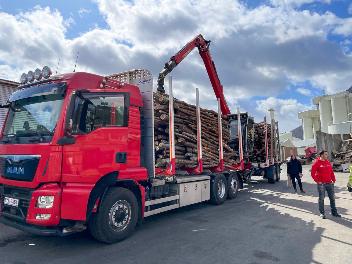 Timburbíll Tandrabrettis með farm af grisjunarviði úr þjóðskóginum á Höfða kominn í hlað við verksmiðjuna á Eskifirði þar sem viðarperlurnar eru framleiddar. Ljósmynd: Tandrabretti