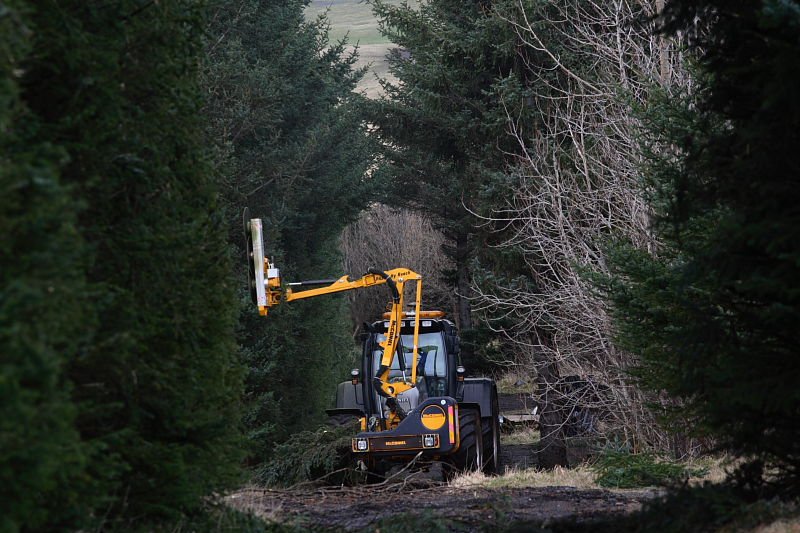 Eitt af vorverknunum í Þjóðskógunum er að klippa trjágróður frá skógarstígum. Þegar trén hækka verður þetta óvinnandi vegur með venjulegum handverkfærum og því nauðsyn að stórvirkari vinnuvélum. Í vikunni mætti Davíð Örn Ingvason verktaki á Tumastaði  í Fljótshlíð og klippti til trjágöng og skjólbelti á staðnum. Davíð á afar góða skjólbeltasög sem búin er þremur hjólsagarblöðum. Getur sögin sagað sverar trjágreinar í sundur án þess að valda frekari skemmdum á trjánum, en klippur vilja merja sverustu greinarnar. Nær Davíð að klippa trjábelti upp í 8-10 m hæð. Sögin hentar einnig vel í klippingu á grennri greinum og til að klippa niður víðibelti.