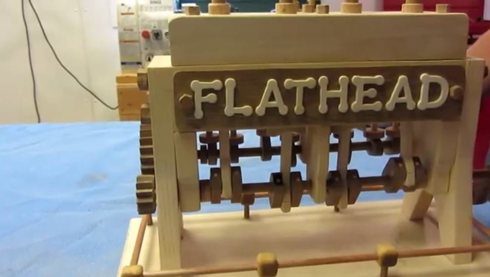 Vélin er fjögurra strokka flathaus-vél (flathead) og hreyfanlegu hlutirnir eru sveifarás, bullustangir og bullur, kambás, ventlar og tímahjól. Alla hluti vélarinnar smíðaði Ken úr afgangstimbri og notaði blindnagla úr tré þannig að eini efniviðurinn er viður. Við smíðina notaði hann venjuleg handverkfæri en einnig rennibekk sem hann segir að hafi komið að góðum notum. Ofan á vélinni er eftirlíking af kveikjuloki, kveikjuþráðum og kertum, allt úr tré en það er einungis upp á útlitið því ekkert af því vinnur með vélinni enda er hún handsnúin.
