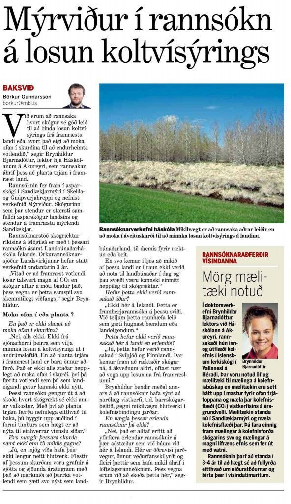 „Við erum að rannsaka hvort skógur sé góð leið til að binda losun koltvísýrings frá framræstu landi eða hvort það eigi að moka ofan í skurðina til að endurheimta votlendið.“ Þetta segir Brynhildur Bjarnadóttir, lektor hjá Háskólanum á Akureyri, í viðtali í Morgunblaðinu í dag þar sem fjallað er um rannsóknarverkefnið Mýrvið.