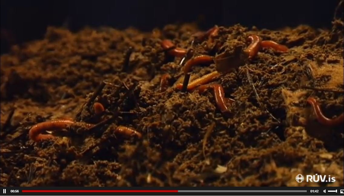 Á bænum Árbakka í Hróarstungu er verið að hræra fóður fyrir ánamaðka. Uppskriftin er einföld, blautir pappakassar, vatn og sauðatað. Svo eru tilrauninar með að lauma laufum eða nálum úr skógarbotninum út í hræruna, sérsníða flóruna að ákveðnum plöntum. „Þetta er búið að standa hérna í þrjár vikur og þá sérðu hér sveppi og allskonar lifnað. Til dæmis rotsveppi sem er matur fyrir ánamaðka.“