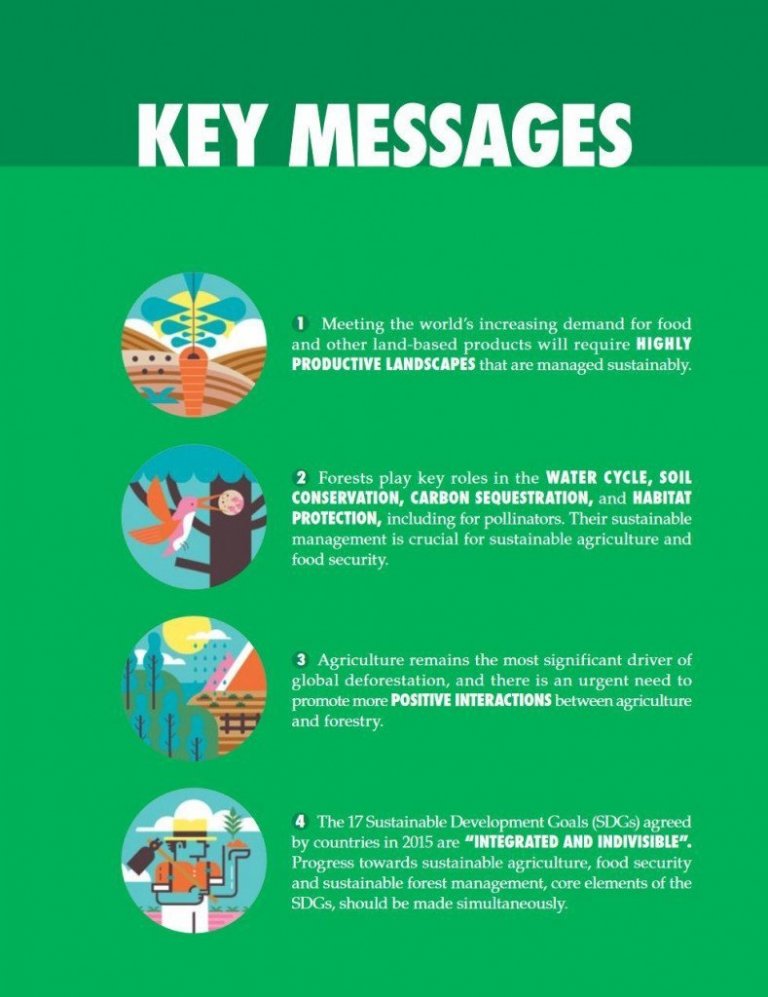 Í fréttatilkynningu frá FAO segir að skógar hafi meginhlutverk í þróun sjálfbærs landbúnaðar og þar komi margt til. Skógar stuðla að eðlilegri hringrás vatns, náttúrlegum vörnum gegn sjúkdómum og óværu, þeir hafa staðbundin áhrif á loftslag og veðurfar og viðhalda búsvæðum fyrir frævandi dýrategundir og fleiri lífverur.