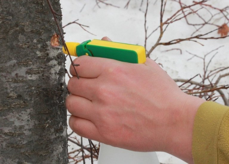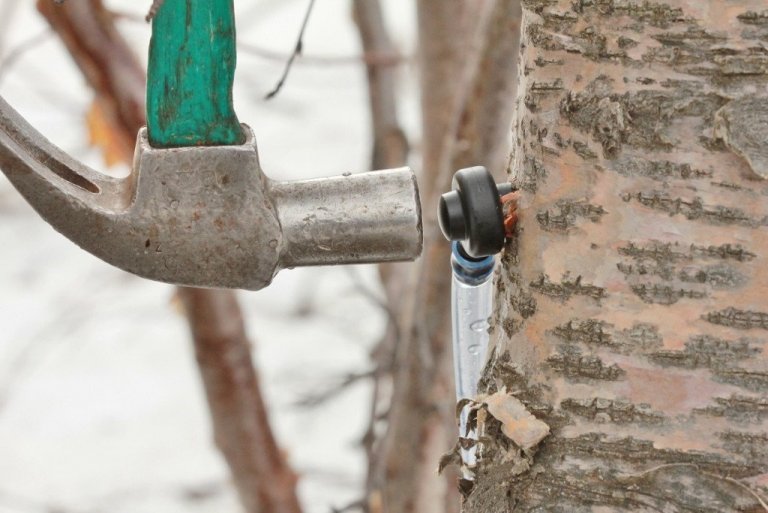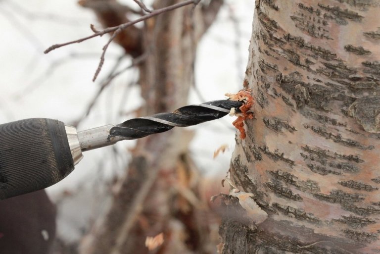 Borað er skáhallt upp á við svo að safinn renni betur út úr sárinu. Notaður er