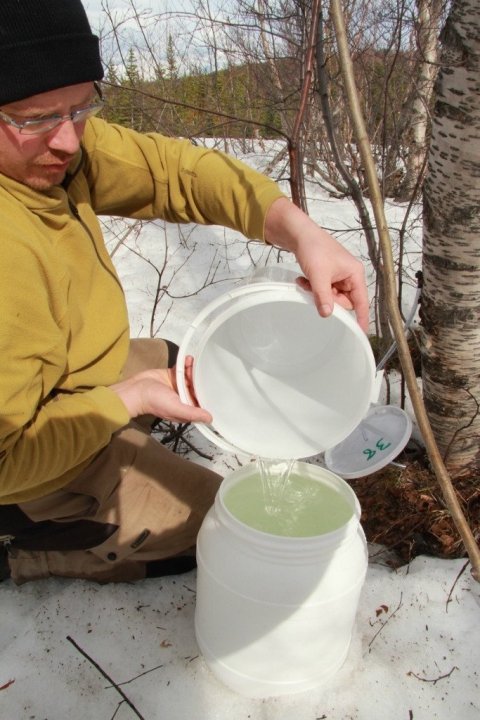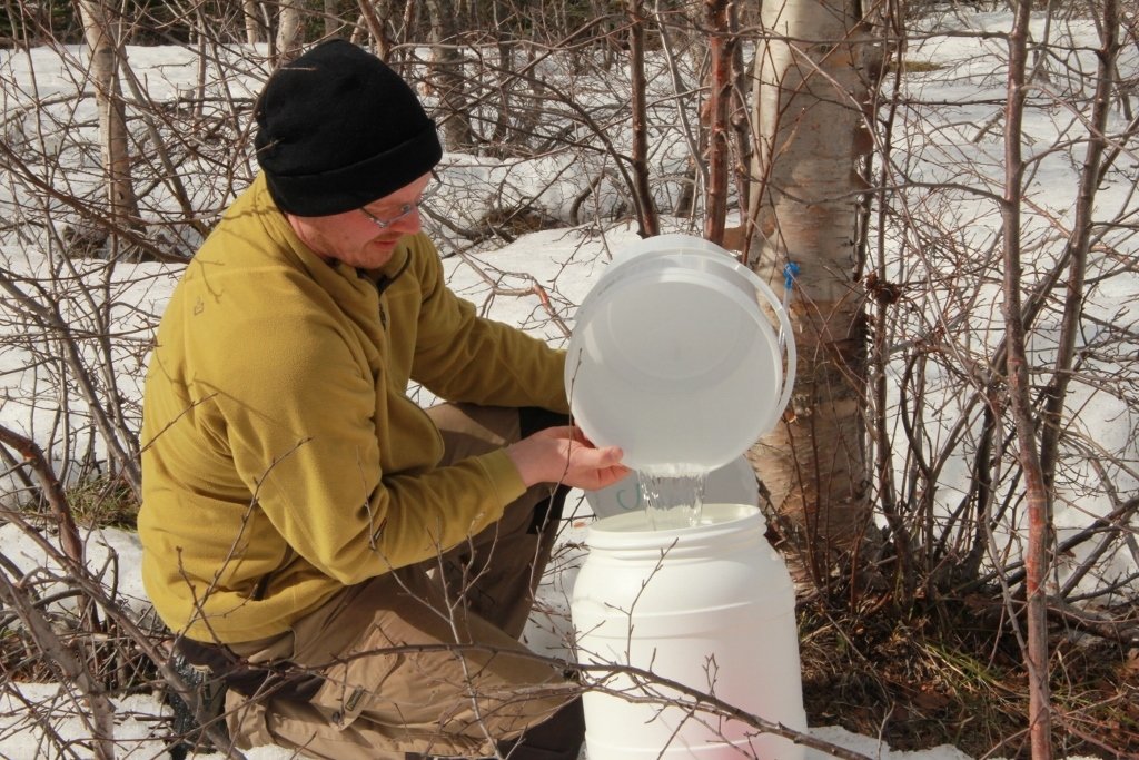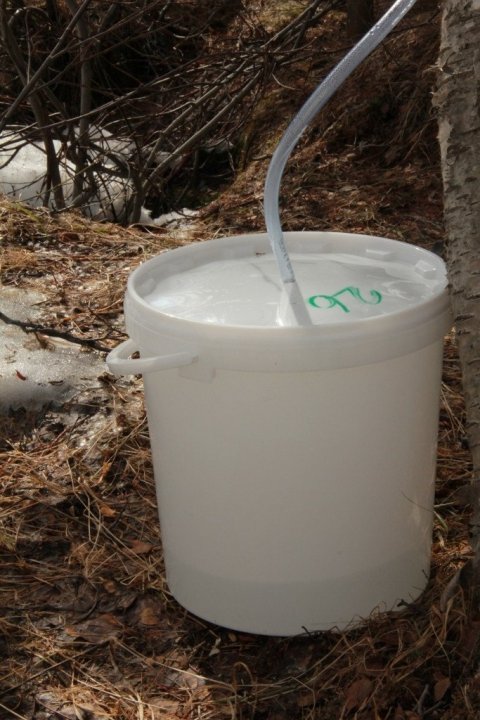 Ef vatnsupptaka í trénu er komin vel af stað ætti fljótlega að fara að seytla safi í slönguna. Slangan er höfð nógu löng til að hún nái niður í fötu með loki sem stillt er upp við stofn trésins. Gert er gat í lok fötunnar sem passar svo að slangan sitji þétt í lokinu.