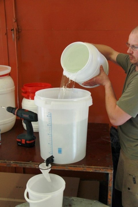 hellir Benjamín úr fötu yfir í fimmtán lítra tunnu.