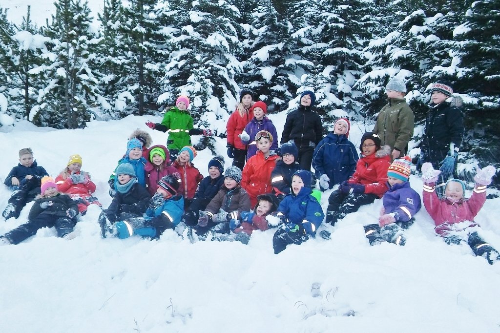 Kátur hópur skólabarna frá Hvanneyri í skóginum að Stóru-Drageyri í Skorradal, ánægð eftir að hafa fundið tvö falleg jólatré og sagað fyrir grunnskólann og leikskólann.