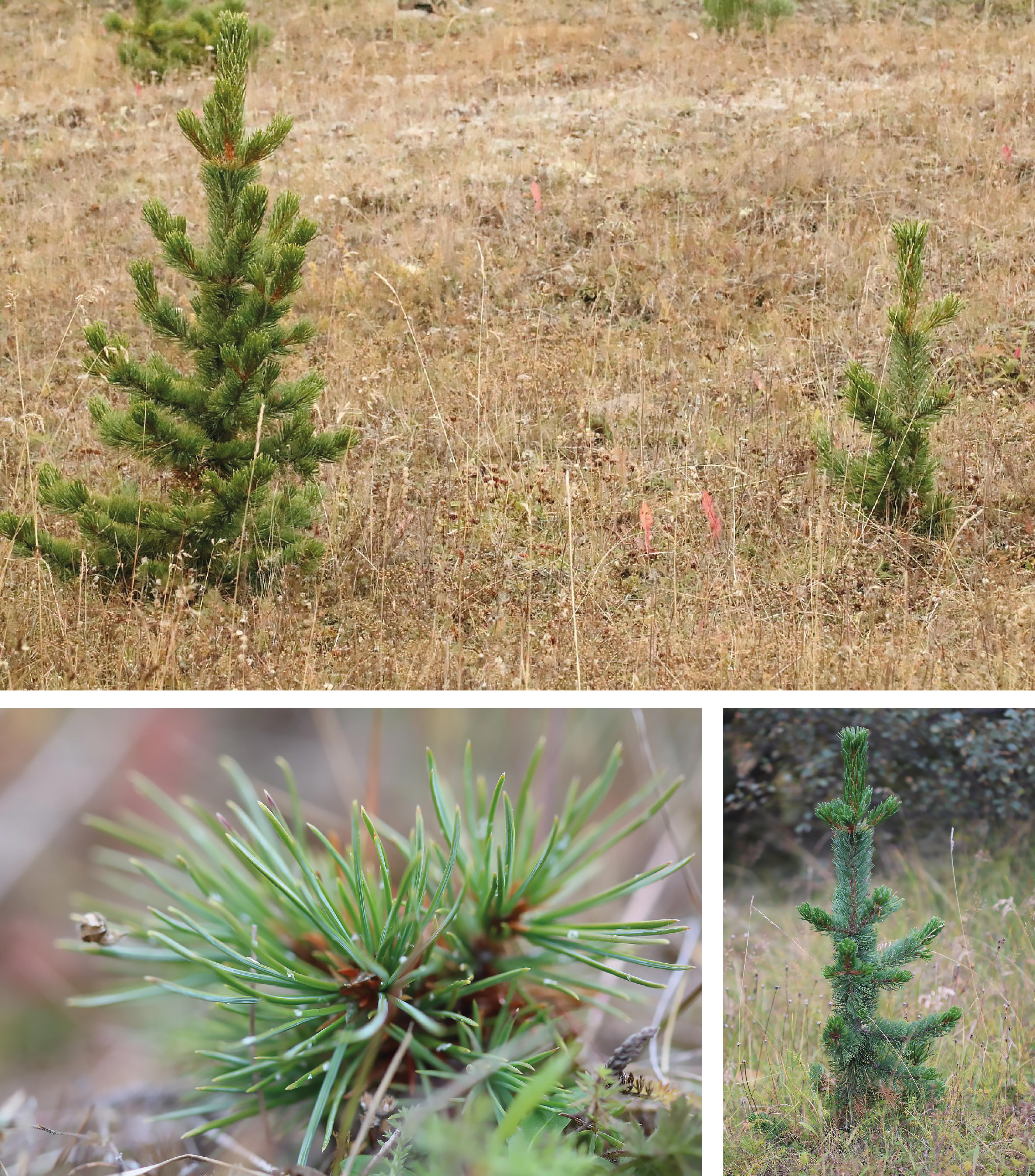 Tvær myndir af broddfurunum við suðurendann á girðingunni utan um Grundarreit. Fyrri myndin tekin innan reits við göngustíginn frá bílastæðinu. Seinni myndin tekin utan við reitinn. Myndir: Sig.A.