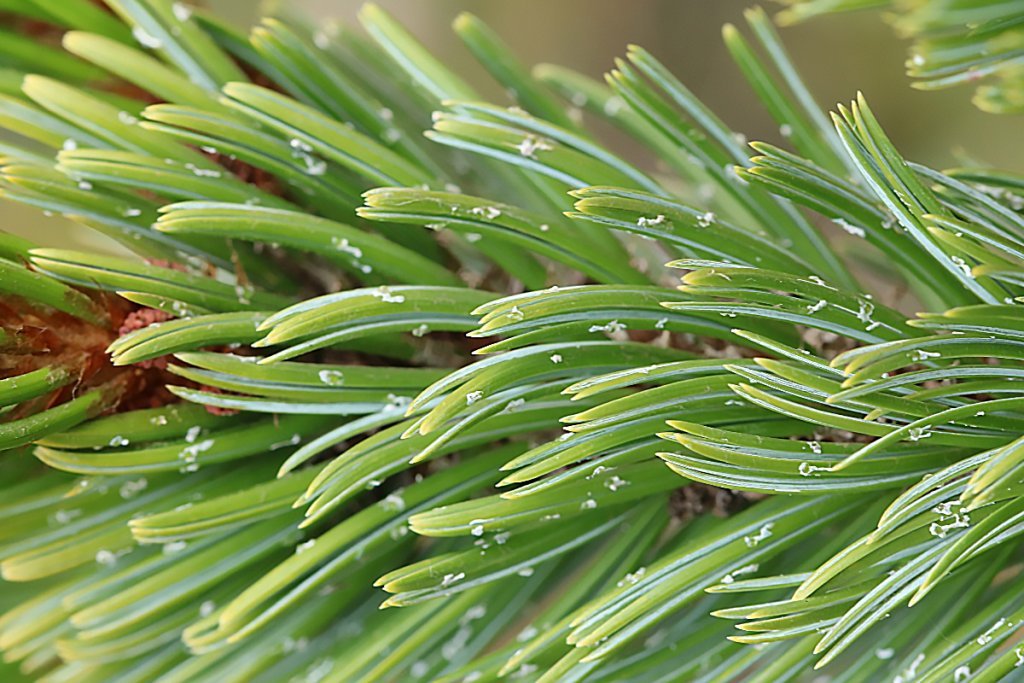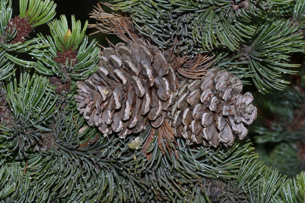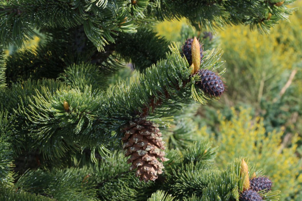 Tvær myndir frá Grund sem sýna helstu einkenni broddfura. Fyrri myndin sýnir opna og lokaða köngla. Einnig má sjá rauðbrún karlblóm. Vel sést hvernig árssprotarnir eru miklu ljósari en eldra barr. Seinni myndin sýnir nærmynd af nálum þar sem harpix-útfellingarnar sjást vel. Myndir: Sig.A.