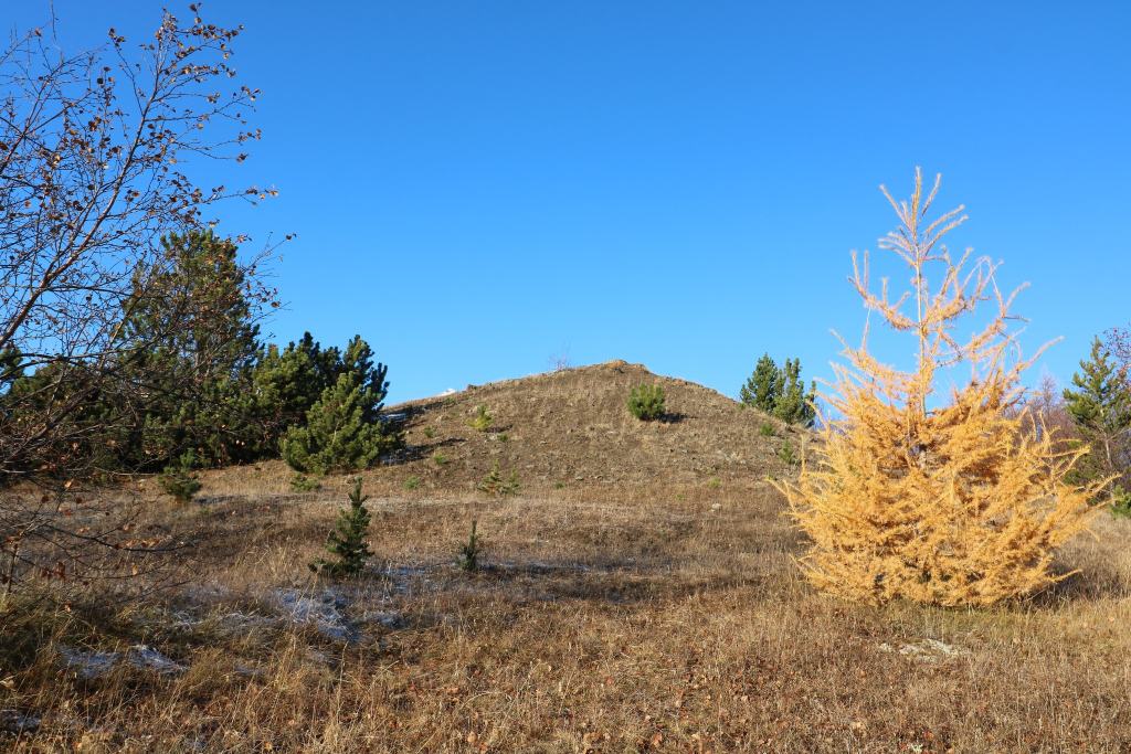 Helguhóll 1. nóvember 2023. Lengst til hægri sér í lerki. Líklegt er að það sé lerkiblendingurinn ´Hrymur´ sem hefur verið plantað þarna. Allt annað lerki á svæðinu var barrlaust með öllu er myndin var tekin. Sjá má sjálfsánar furur á myndinni. Mynd: Sig.A.