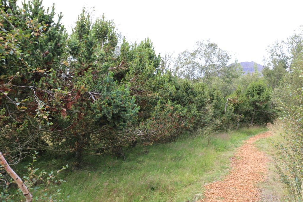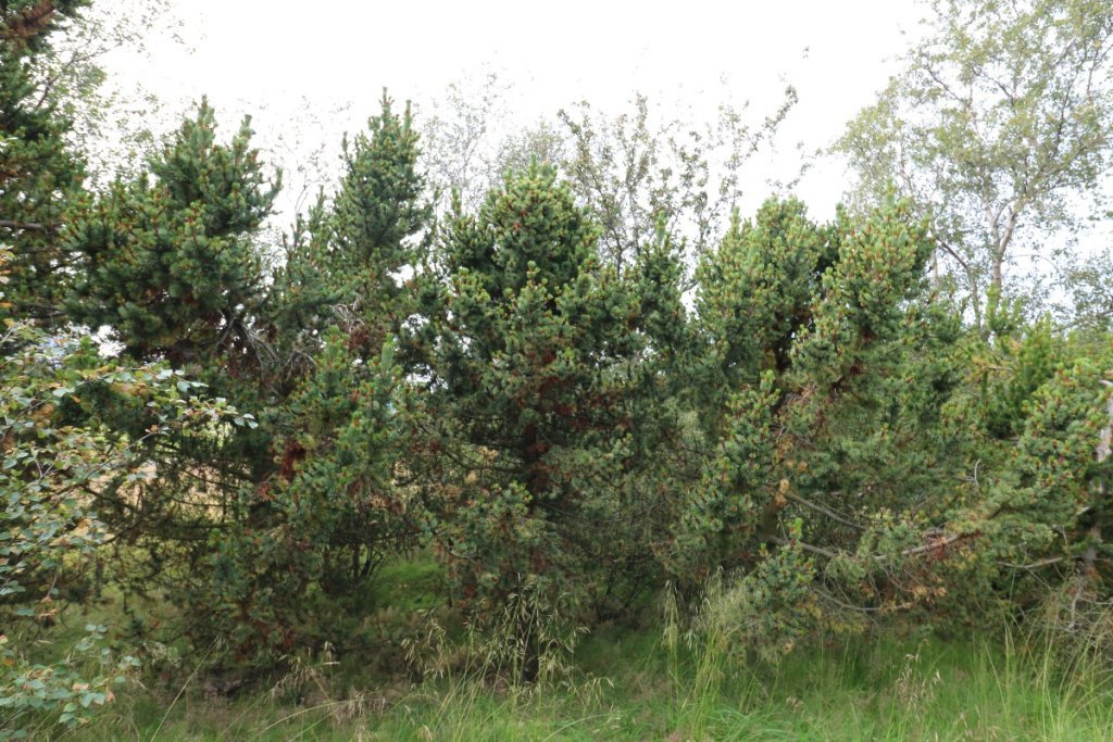 Sjálfsánar trjáplöntur í Helguhól. Þessi með rauðu laufblöðin er reynir. Lengst til hægri sér í litla bergfuru. Fremst eru tvær státlegar broddfurur og ein minni er lengst til vinstri. Á milli toppanna á stærstu broddfurunum má einnig sjá í litla furu. Mynd: Sig.A.
