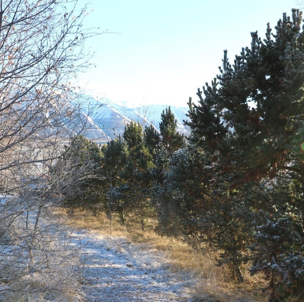 Göngustígurinn inn í Grundarreit eftir bjarta frostnótt seint að hausti. Til vinstri eru broddfurur, Pinus aristata. Til hægri er glæsileg skógarfura, Pinus sylvestris. Mynd: Sig.A.