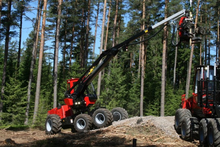 Myndarlegar skógarhöggsvélar sýndar að verki.