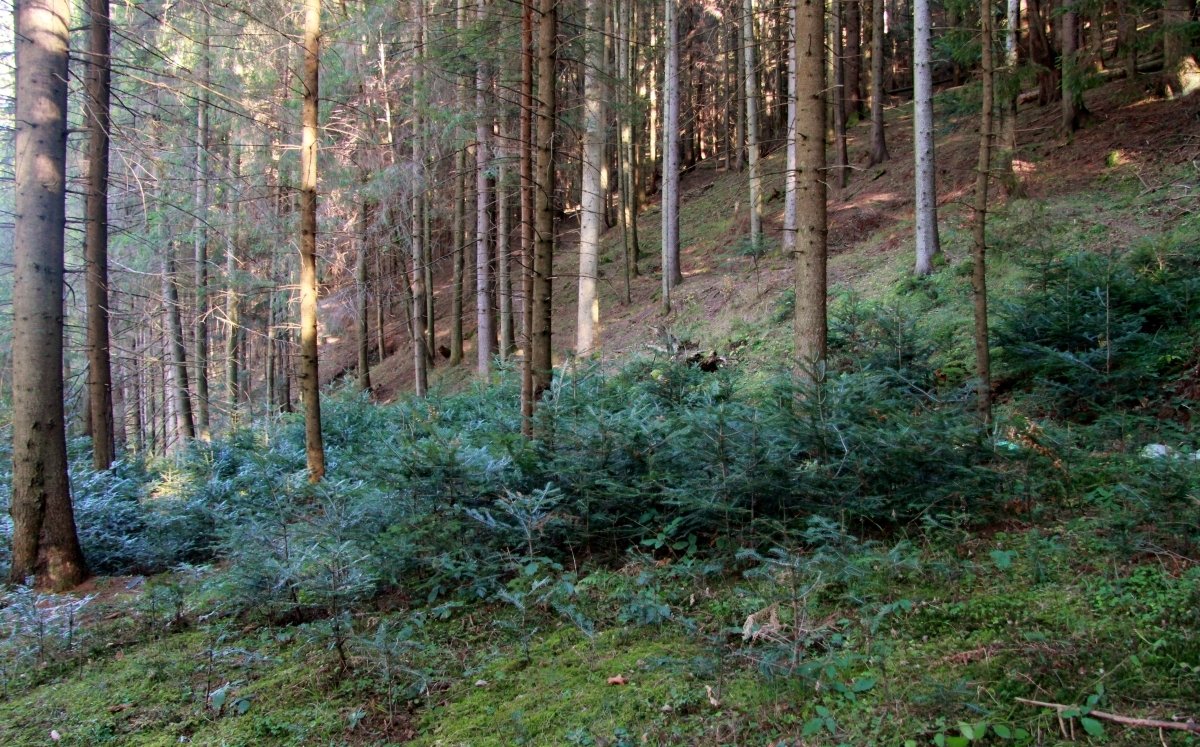 Nytjaskógur í Rúmeníu. Þarna vex rauðgreni og evrópuþinur, að mestu af sjálfu sér upp af fræi. Aðeins er gróðursett í bletti sem skógurinn nær ekki sjálfur að sá sér í eftir rjóðurfellingu. Hér sést ungviði evrópuþinsins sem bíður þess að vaxa upp þegar eldri tré falla eða eru felld.