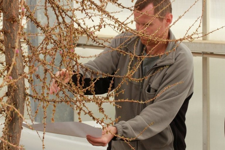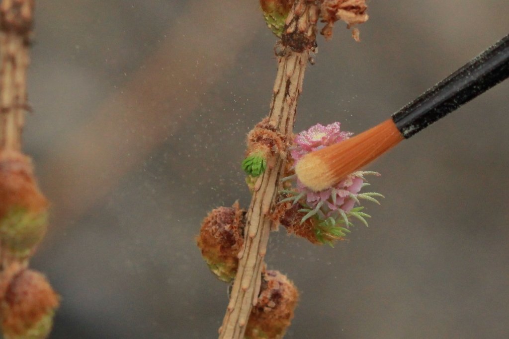 Mjúkur pensill er notaður til að koma frjókornunum í frævur lerkiblómanna