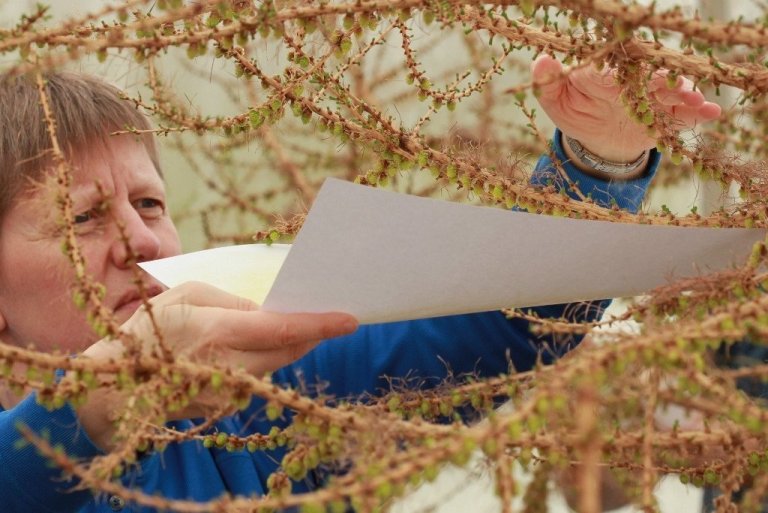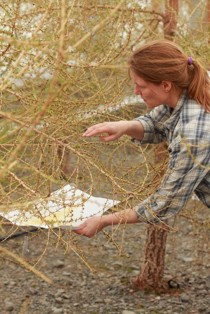 Rakel Jónsdóttir safnar frjói af evrópulerki.