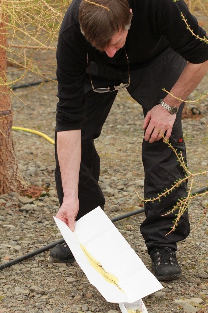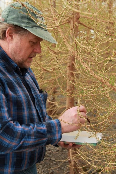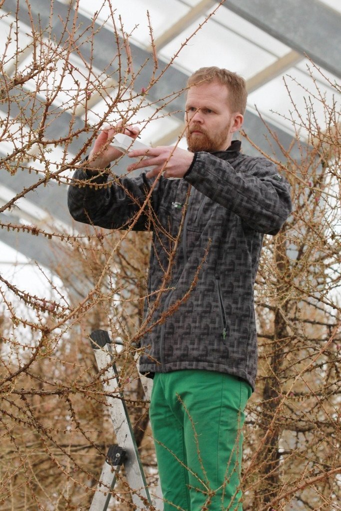 Teitur Davíðsson safnar frjói af evrópulerki. Ef vel er rýnt má sjá frjóduftið
