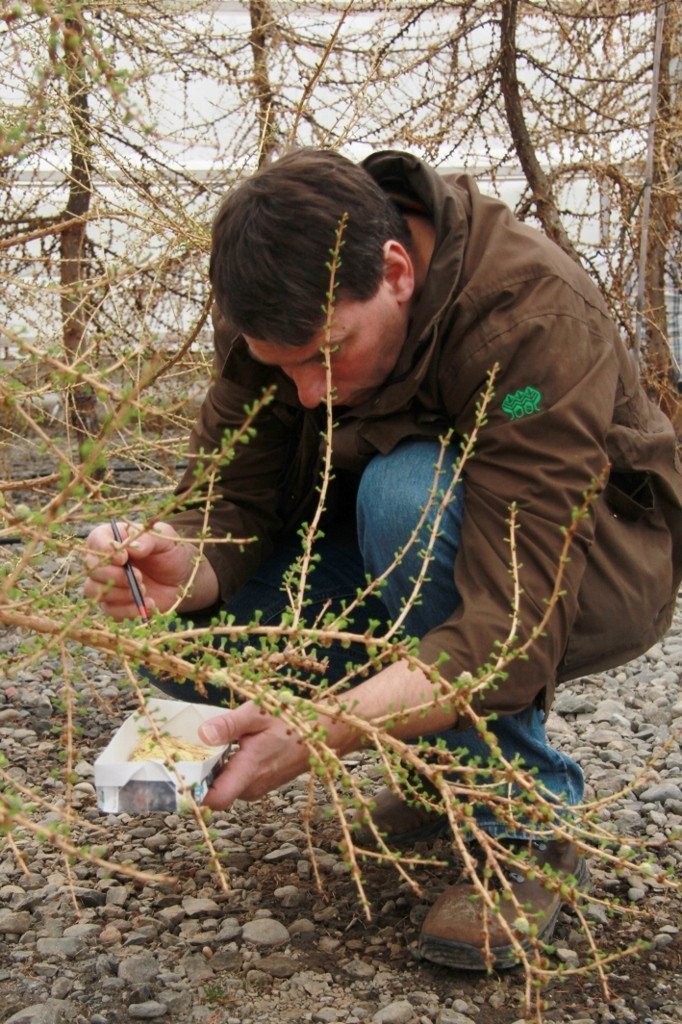 Brynjar Skúlason penslar frjói af evrópulerki á kvenblóm rússalerkis.