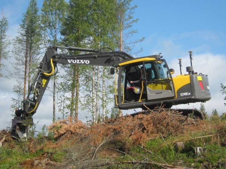 Hér er Óskar að gróðursetja á myndarlegri gröfu í finnskum skógi.